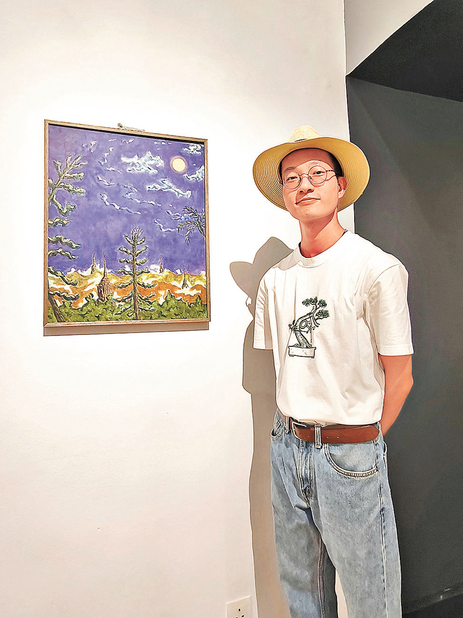 另一位本地青年藝術家Lewis本次特別創作了油畫作品《滿月》。他在接受香港文匯報記者採訪時表示,今年早些時候,他曾前往泰國清邁旅居三個月。「我在上水成長,那邊也有很多山脈和鄉村的河流,所以我在去到清邁後,就好像看到了自己成長的地方,(在這基礎上)還多了一些異域文化。比如他們的文字、語言跟我們想像的不同,可是那個環境又那麼相似,所以我就想把這種鏡像的感覺畫出來。」