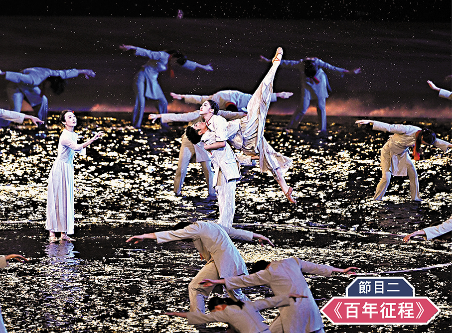 高潮迭起的文藝演出環節隨後正式開啟。第一章《同根同源》循着文明脈絡回溯,以「1,000多年前,廣州就是海上絲綢之路的一個起點」回望文明時空,以「100多年前,就是在這裏打開了近現代中國進步的大門」縱覽奮鬥征程,以「40多年前,也是在這裏首先蹚出來一條經濟特區建設之路」詠嘆改革開放的時代史詩,展示了粵港澳大灣區一脈相承,同根同源,生生不息。