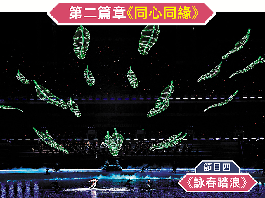 第二章《同心同緣》將武術、粵劇、南獅、英歌等傳統非遺與現代藝術相結合,展現中華體育精神,傳揚中國時代力量,刻畫的是嶺南家園,同心同緣。在粵韻武魂的龍騰獅歡中,大灣區各城市同舟共濟,一往無前。