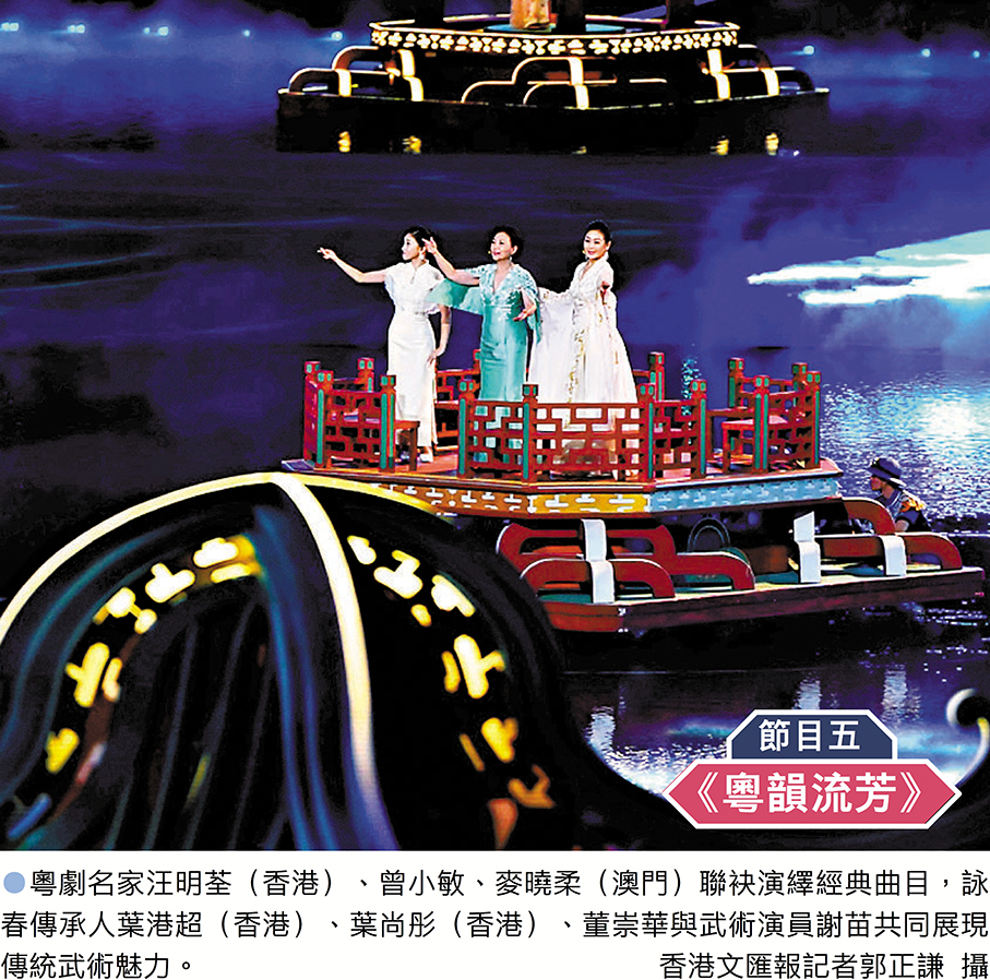 香港文匯報訊(記者 黃寶儀、敖敏輝、盧靜怡、胡若璋、李紫妍 廣州報道)隨着一段來自千年前的金石之音《彩雲追月》悠然響起,香港維多利亞港、澳門大三巴、廣州「小蠻腰」 等標誌性景觀相繼在十五運開幕式現場九塊大屏幕上徐徐鋪展……一場以「圓夢未來」為主題的文體盛宴11月9日晚正式啟幕。演出共分「同根同源、同心同緣、同夢同圓」 三大篇章,將嶺南醒獅、龍舟競渡、中華戰舞等傳統文化瑰寶,與人工智能、虛擬現實技術、機器人等前沿科技深度融合,打造出一場沉浸式的「古今對話」。
