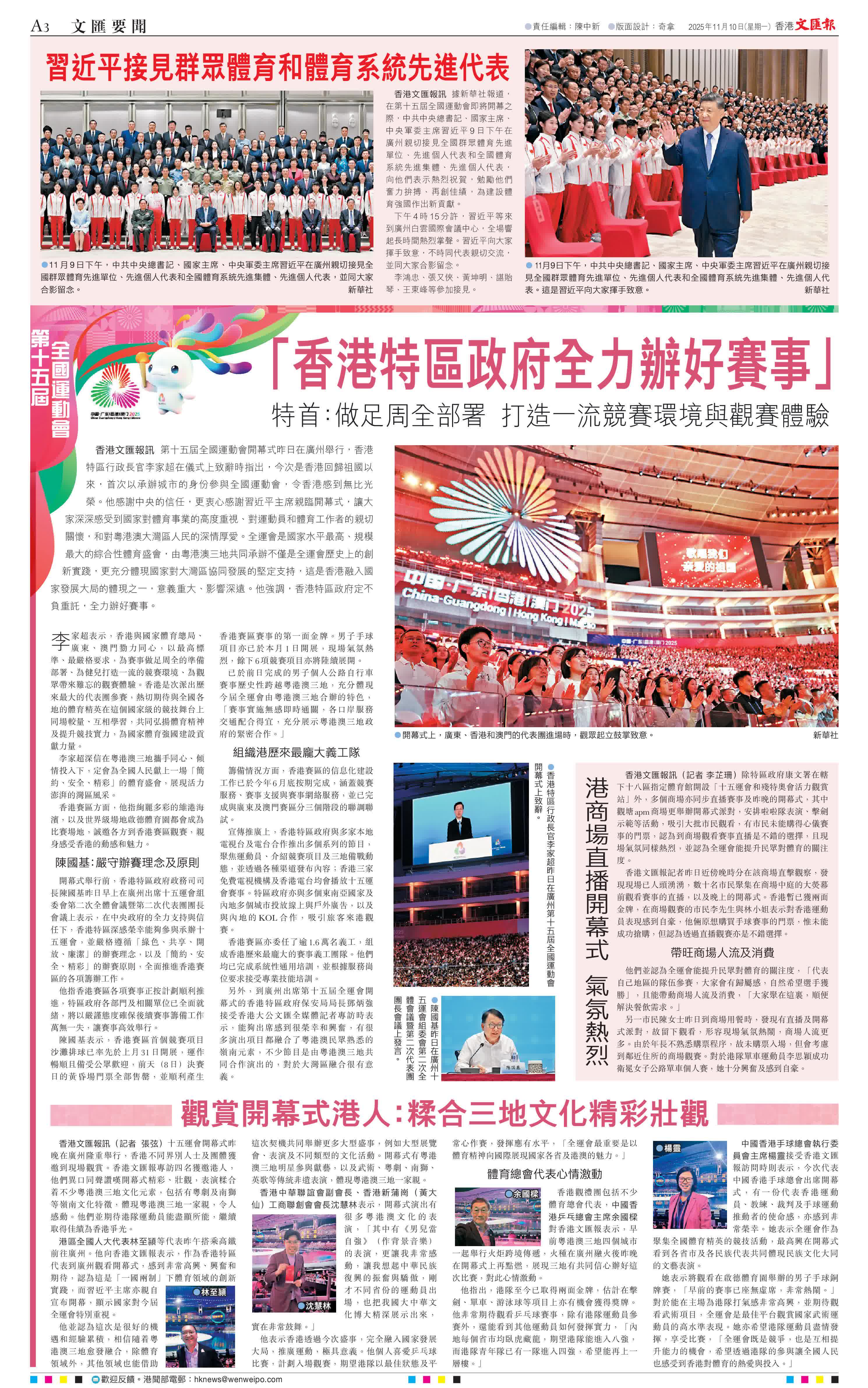 李家超深信在粵港澳三地攜手同心、傾情投入下,定會為全國人民獻上一場「簡約、安全、精彩」的體育盛會,展現活力澎湃的灣區風采。