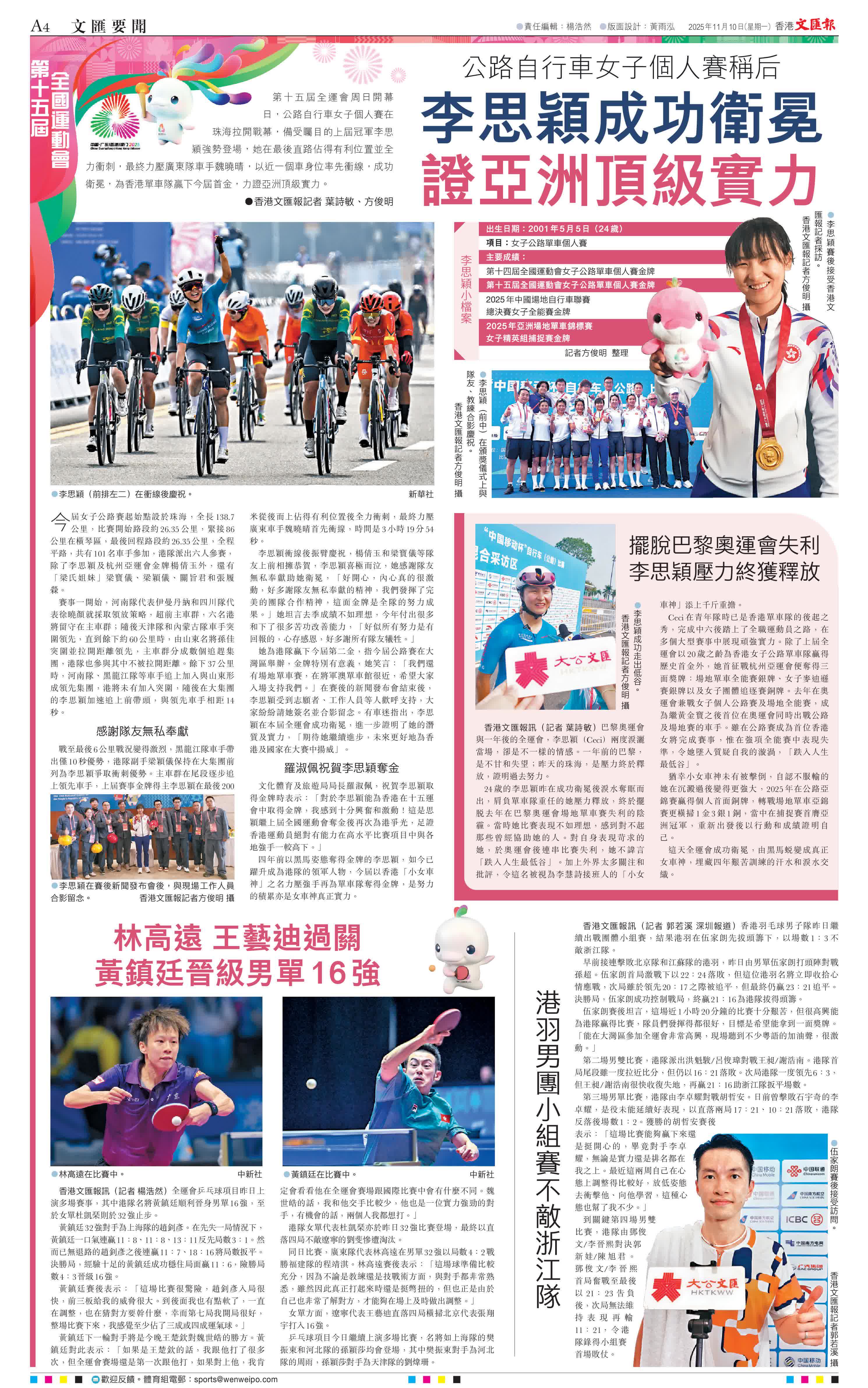 四年前以黑馬姿態奪得金牌的李思穎,如今已躍升成為港隊的領軍人物,今屆以香港「小女車神」之名力壓強手再為單車隊奪得金牌,是努力的積累亦是女車神真正實力。