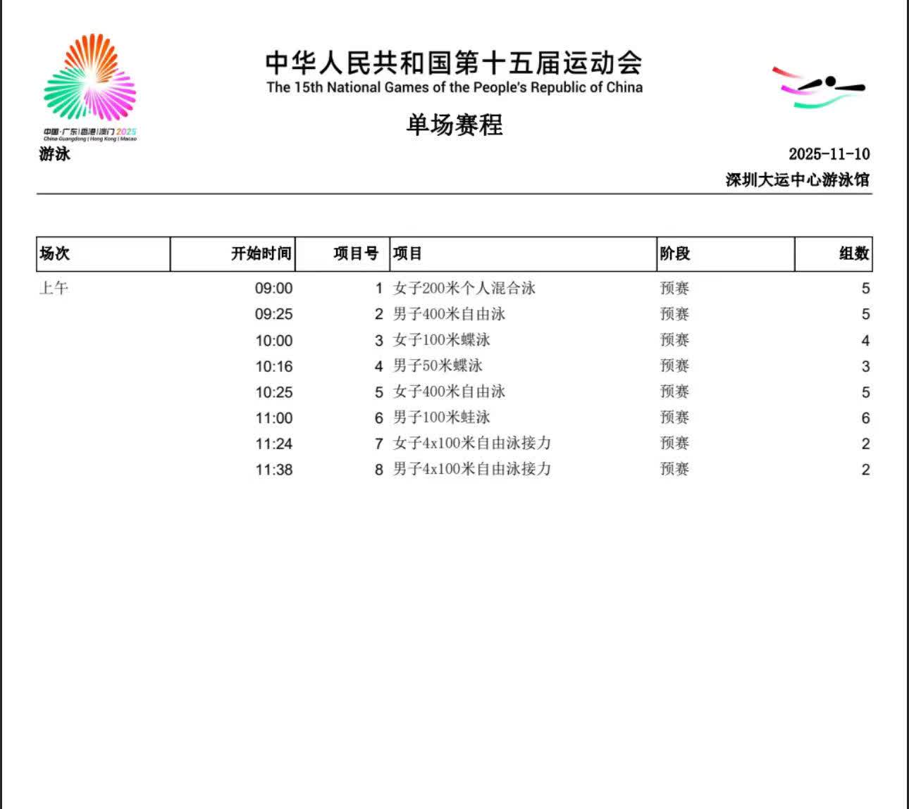 (大公文匯全媒體記者 夏方芳)11月10日,第十五屆全國運動會游泳賽事開啟第一個比賽日。首日將進行男子400米自由泳、女子100米蝶泳、男子100米蛙泳等多個熱門項目的預賽,國家隊游泳名將潘展樂、汪順、覃海洋、孫楊、張雨霏、余依婷等將出戰。