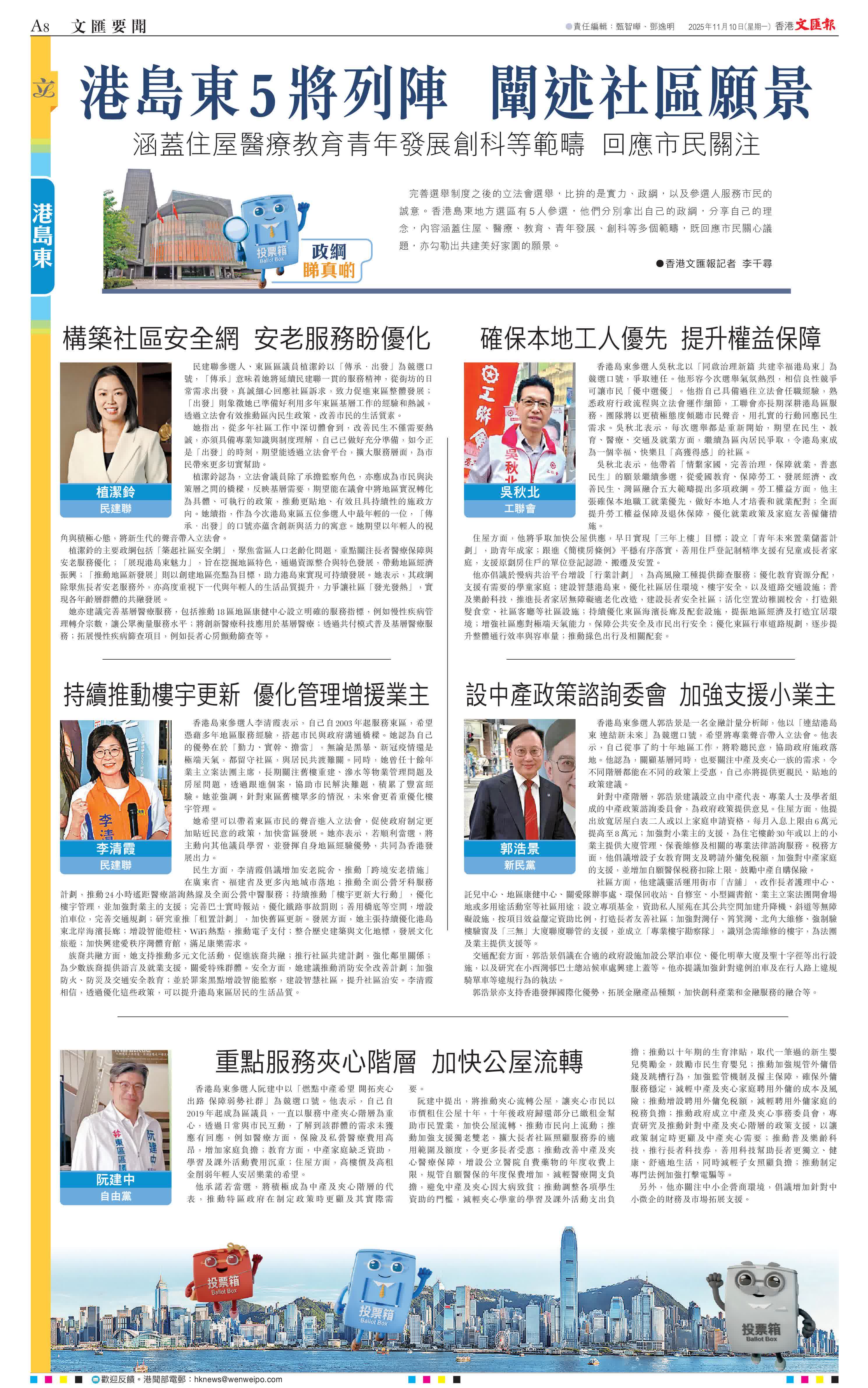 (香港文匯報記者 李千尋)完善選舉制度之後的立法會選舉,比拚的是實力、政綱,以及參選人服務市民的誠意。香港島東地方選區有5人參選,他們分別拿出自己的政綱,分享自己的理念,內容涵蓋住屋、醫療、教育、青年發展、創科等多個範疇,既回應市民關心議題,亦勾勒出共建美好家園的願景。