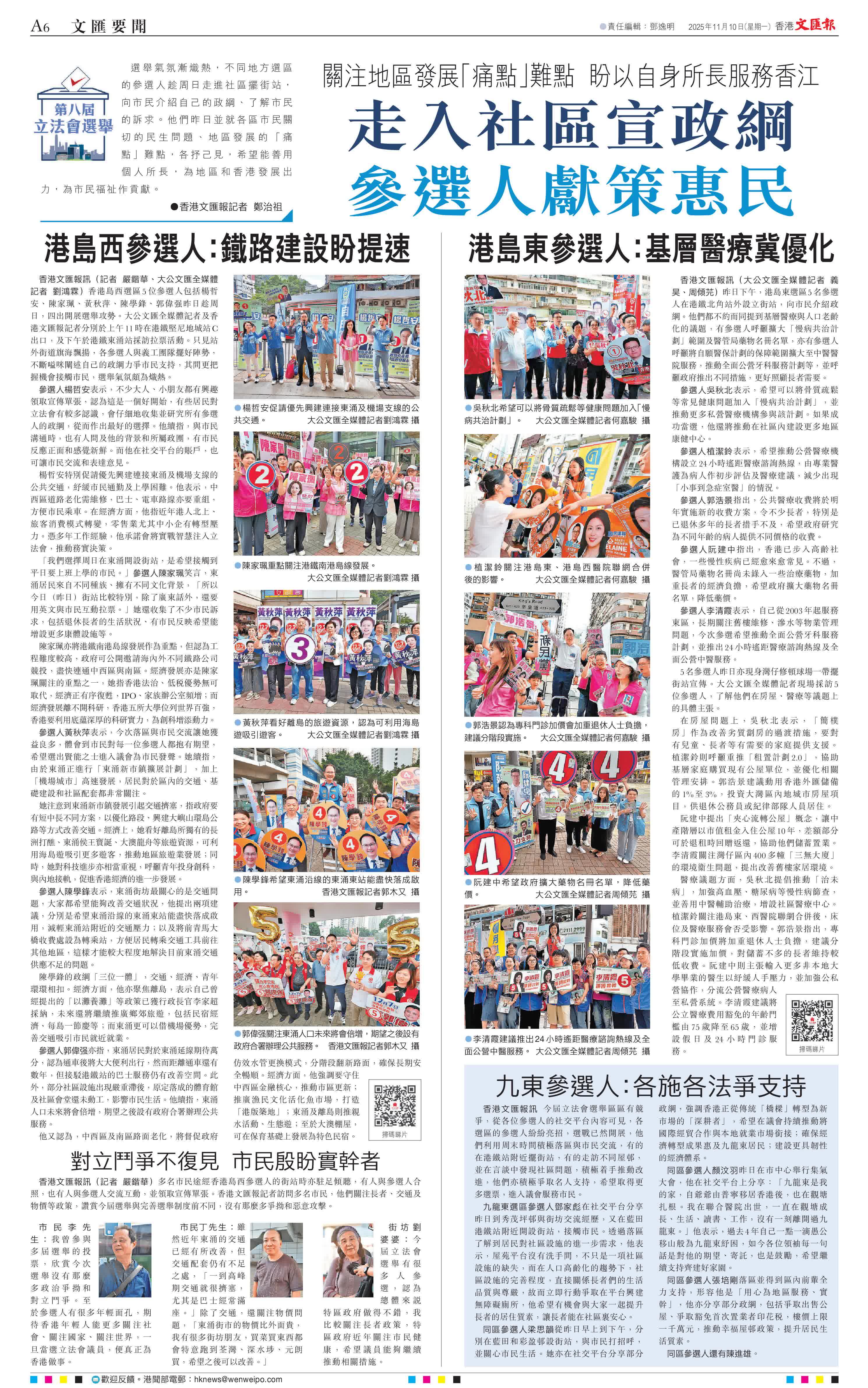 今屆立法會選舉區區有競爭,從各位參選人的社交平台內容可見,各選區的參選人紛紛亮招,選戰已然開展,他們利用周末時間積極落區與市民交流,有的在港鐵站附近擺街站,有的走訪不同屋邨,並在言談中發現社區問題,積極着手推動改進,他們亦積極爭取名人支持,希望取得更多選票,進入議會服務市民。