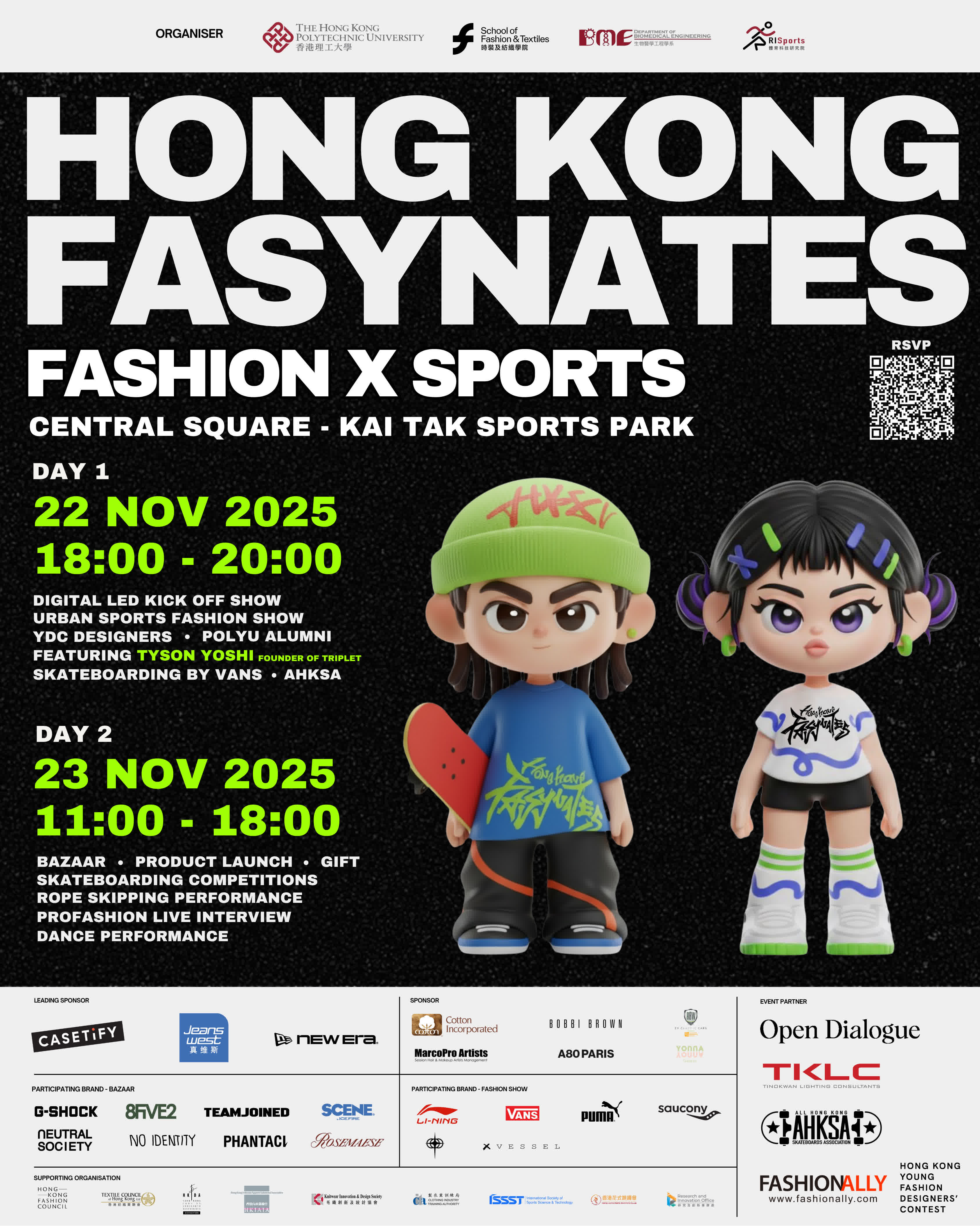 香港文匯報訊 理大時裝及紡織學院、生物醫學工程學系及體育科技研究院首次聯合主辦全新時尚運動跨界盛會「HONG KONG FASYNATES 2025:時尚X運動」,於11 月22 日至23 日於啟德體育園中央廣場舉行。時尚融合體育,活動涵蓋時裝匯演、表演、市集、運動體驗等一系列精彩活動。其中首日的開幕HONG KONG FASYNATES 城市運動時裝匯演為活動亮點,服裝品牌Triplet主理人Tyson Yoshi亦會出席活動,為時裝匯演揭開序幕;時尚品牌VANS 及全香港滑板協會(AHKSA) 的專業選手亦會共同呈獻「Skate to Style」,將街頭文化與時尚創意融合,燃點全場。兩天活動免費開放予公眾參與,名額有限,須預先登記入場。