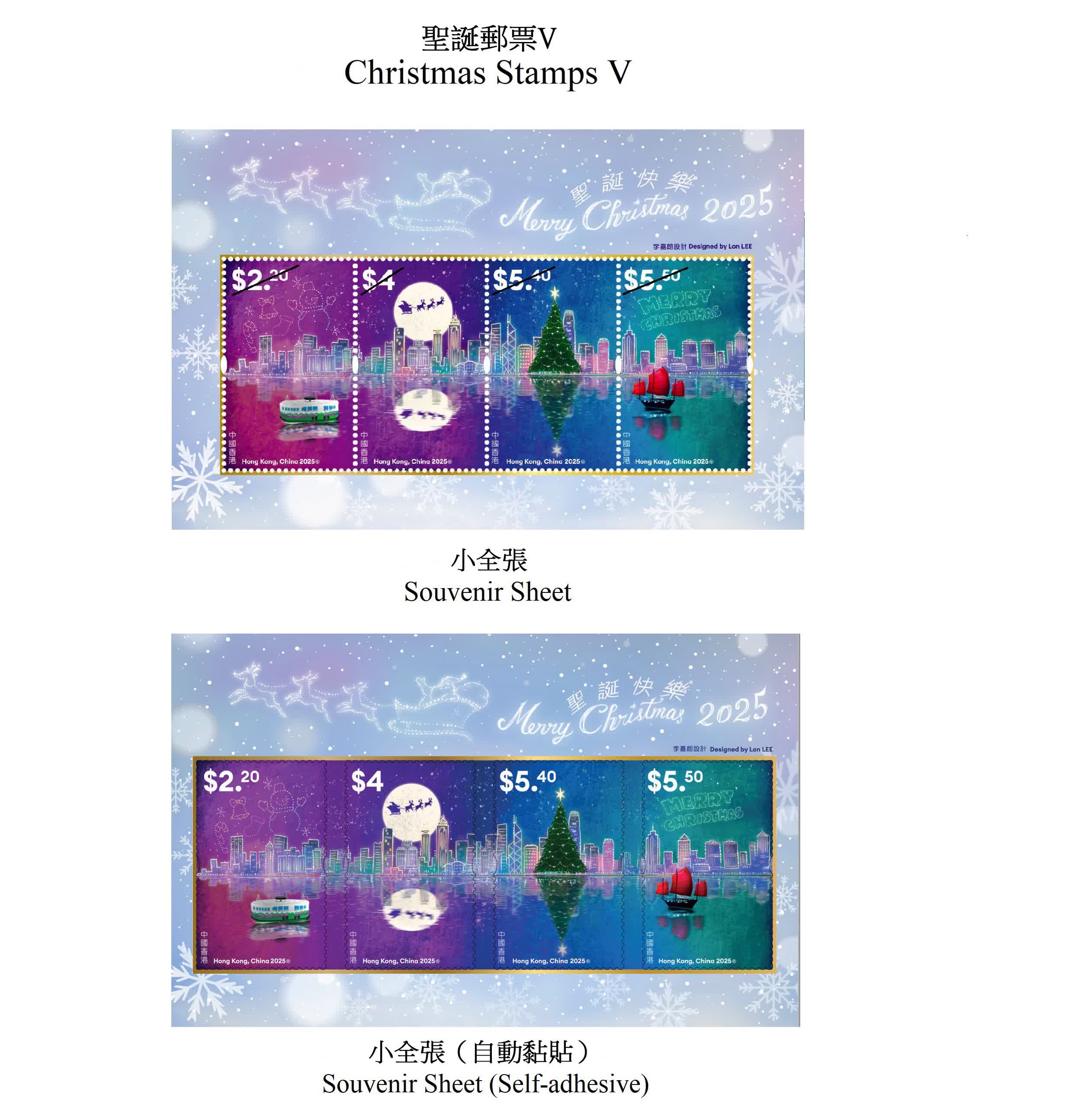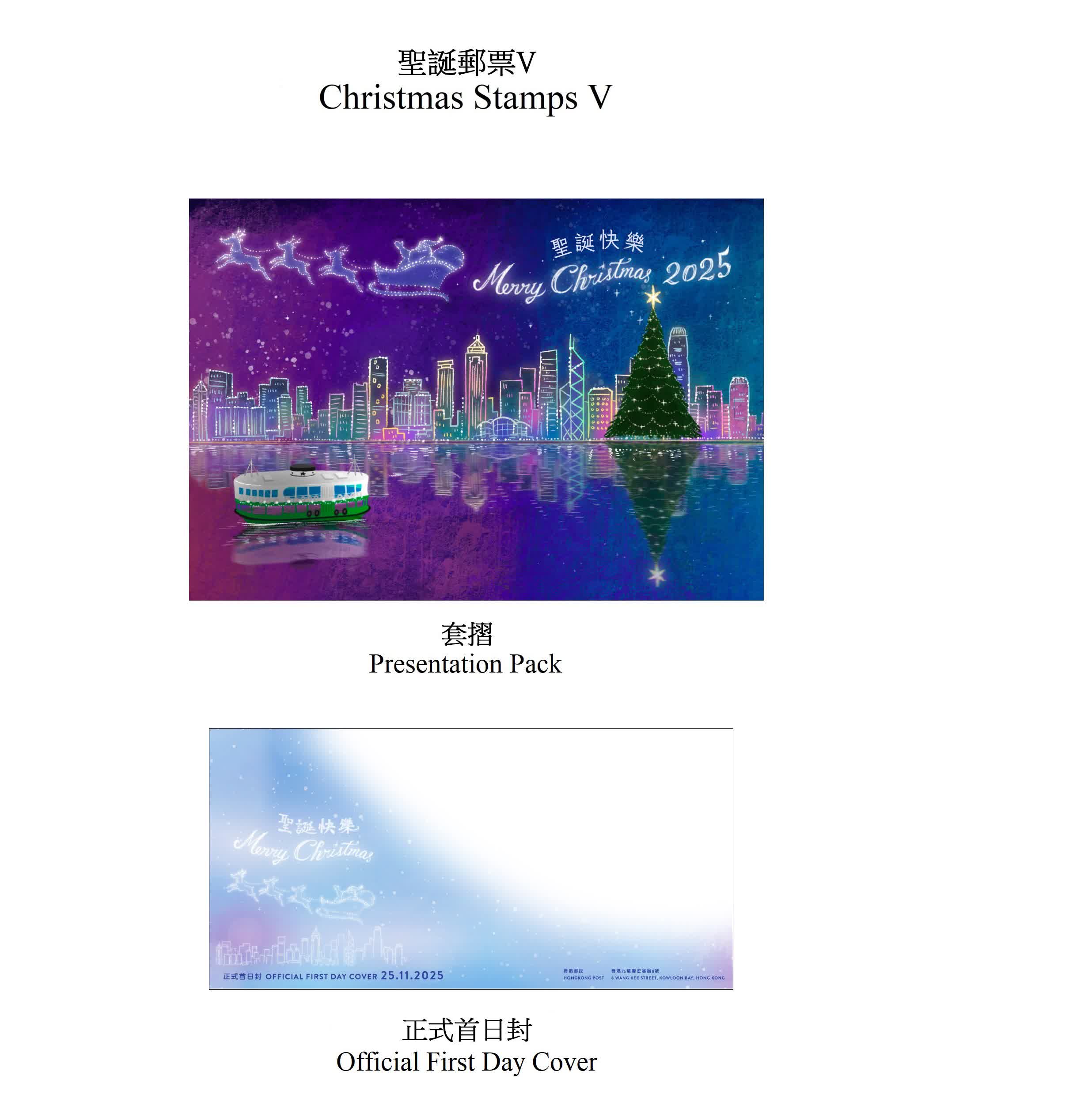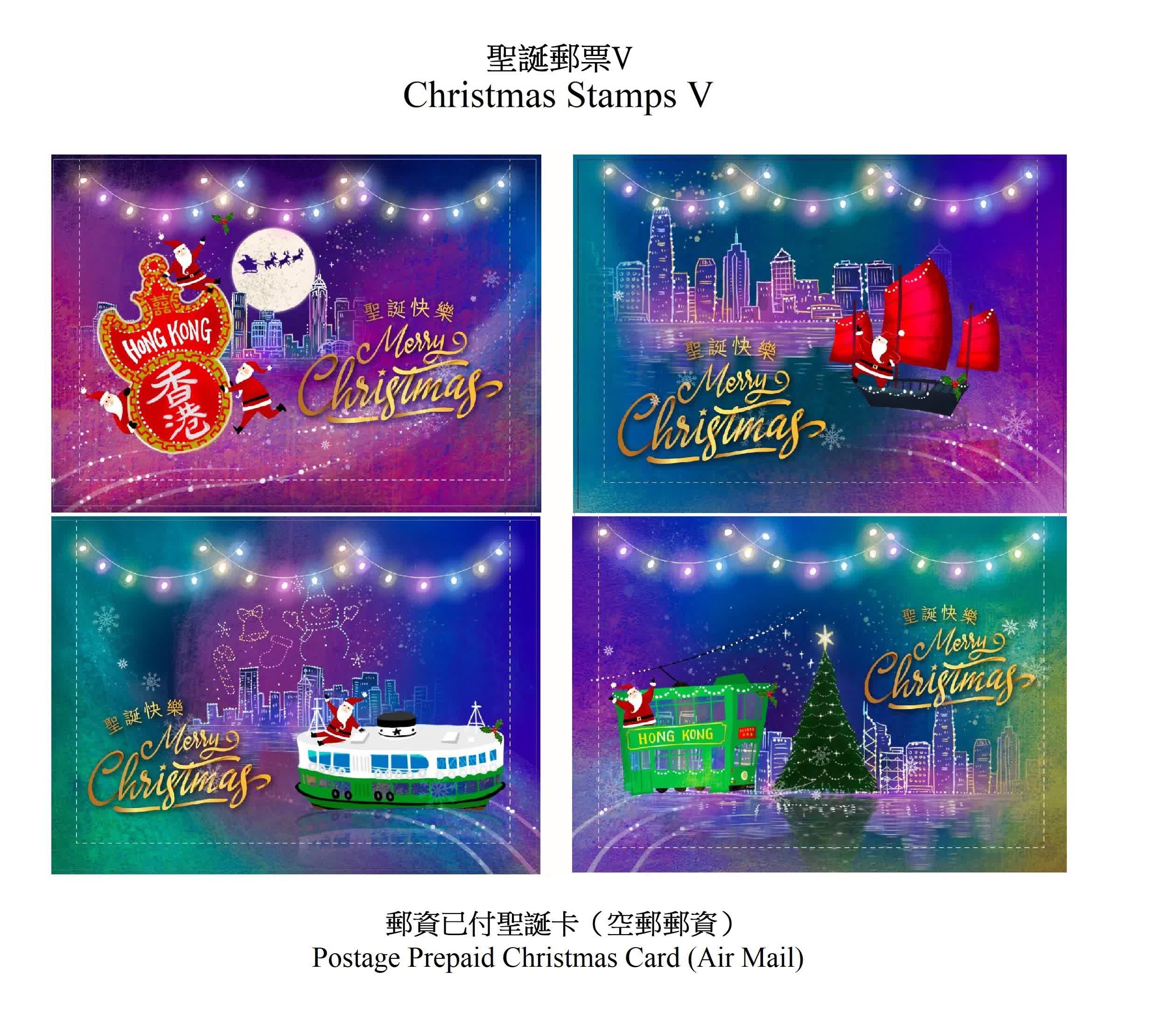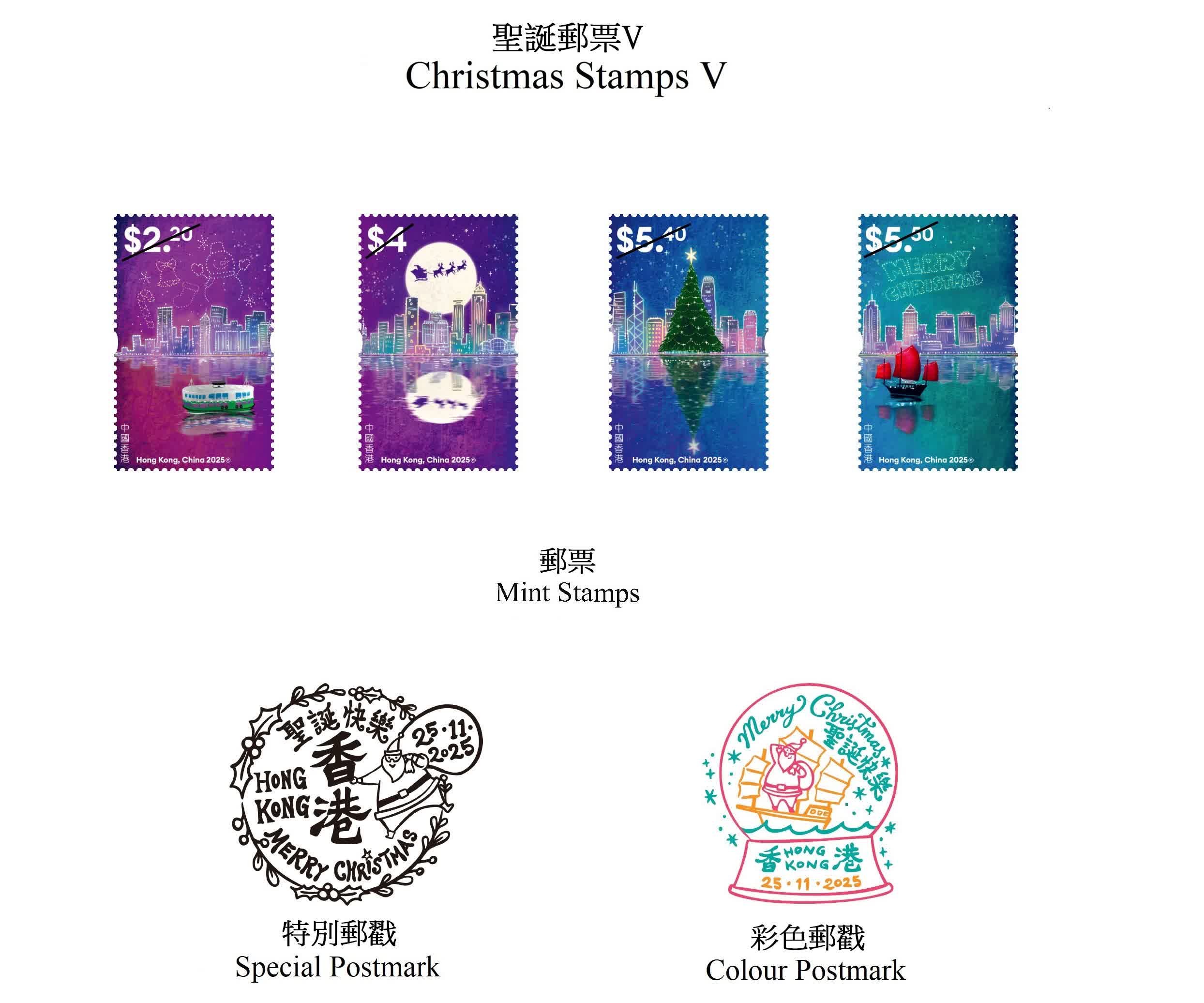 「聖誕郵票V」為題的特別郵票及相關郵品將於11月25日(星期二)推出發售。全線郵政局和香港郵政網上購物平台「郵購網」由明日(11日)起發售「聖誕郵票V」正式首日封。這套特別郵票及相關郵品將於11月25日起在各郵政局及「郵購網」發售,而貼有特別郵票的已蓋銷首日封及郵資已付聖誕卡(空郵郵資)只限在集郵局發售。