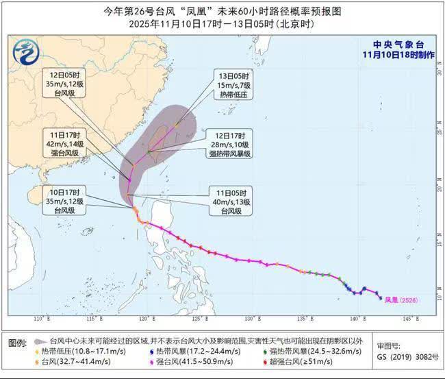 大風預報:10日20時到11日20時,東海南部海域、台灣以東洋面、黃岩島、中沙群島、南海大部、福建沿海、廣東沿海、台灣島沿海將有6-8級、陣風9-10級的大風,台灣海峽、巴士海峽、南海東北部和中東部的風力可達9-11級,陣風12-13級,颱風「鳳凰」中心經過的附近海域和地區風力可達12-14級,陣風15-16級。