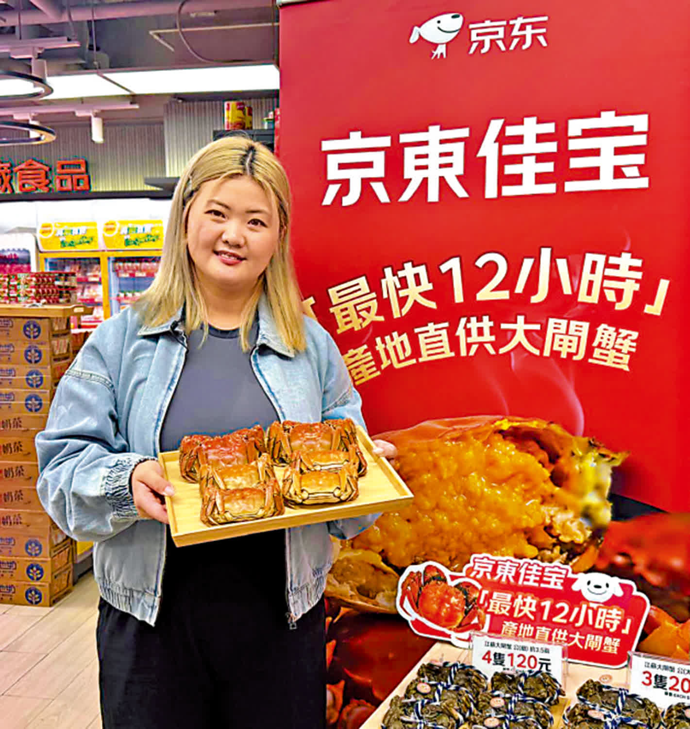 京東集團於今年8月收購本地超市佳宝,集團創新零售佳宝業務部採購部負責人林凱欣表示,佳宝超市本周二至周三(11日至12日)將首度參與京東購物優惠促銷,全港門店有八折優惠。月前京東已率先供應首批5,000公斤大閘蟹到港。她並指,開售首三日已累計售出約一萬隻大閘蟹,而今個蟹季將引入6萬公斤,即約35萬至37萬隻大閘蟹供港發售。她又稱,佳宝超市所售大閘蟹較市面其他零售商售價平均便宜約20%,當中約5.5両的公蟹推廣價200元3隻,約3.5両的公蟹及母蟹分別售120元4隻及120元3隻,以性價比吸引本港消費者。