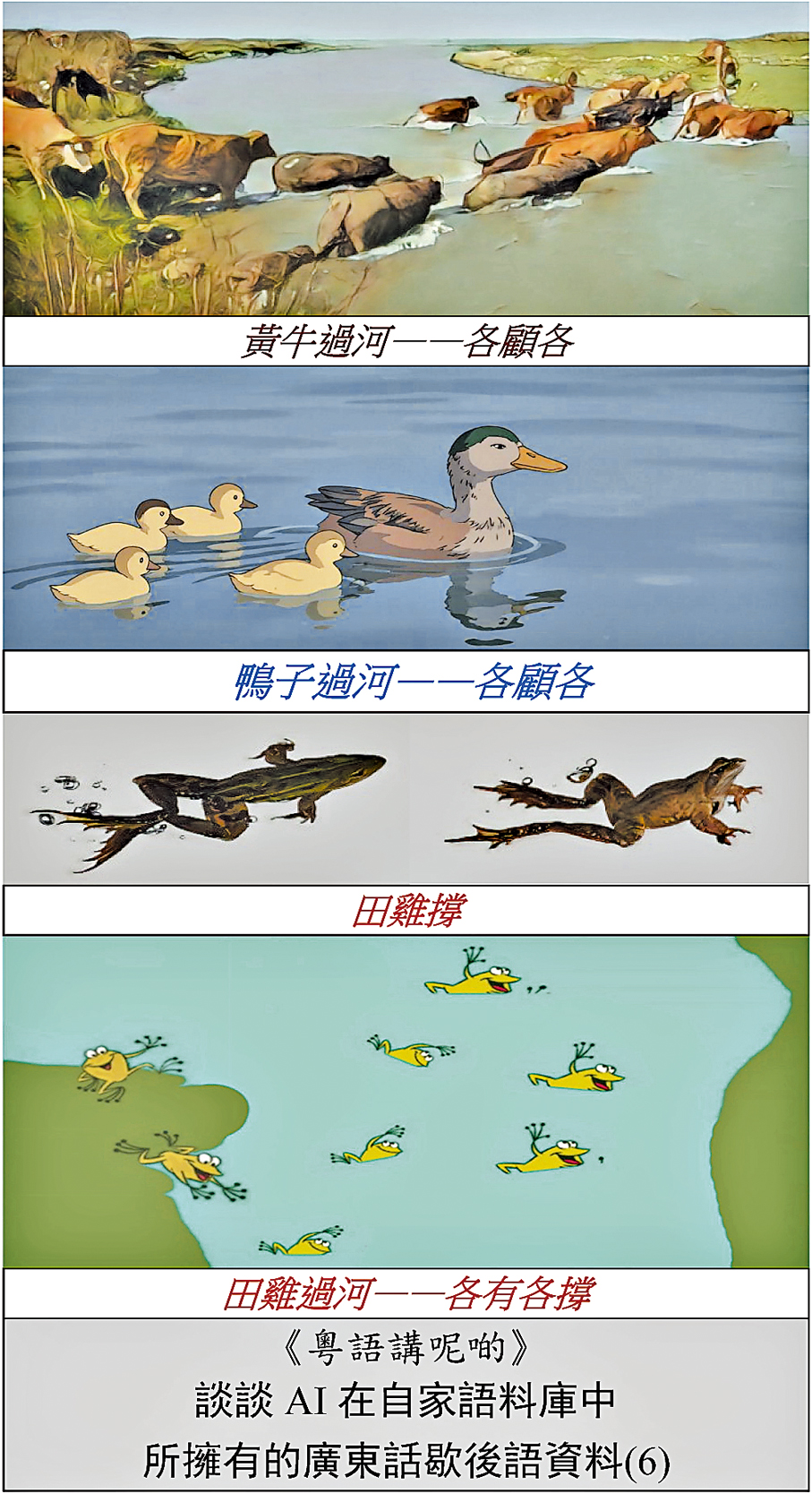 從上述資料顯示,「田雞過河」的寓意應來自「黃牛過河」或「鴨子過河」: