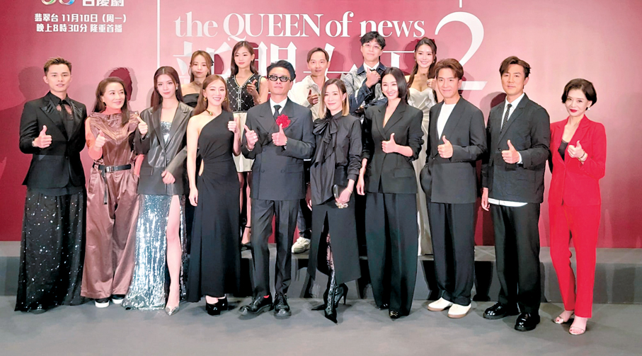 香港文匯報訊(記者 梁靜儀)佘詩曼(阿佘)、黃宗澤(Bosco)、高海寧、王敏奕、馬國明、譚俊彥(Shaun)、夏文汐、陳曉華、何廣沛、吳業坤等,昨日盛裝出席無綫台慶劇《新聞女王 2》首映禮,電視廣播有限公司行政主席許濤JP、總經理(商務營運)蕭世和、 首席增長官(市場及營業)吳靜雯及總監製鍾澍佳等,與一眾演員祝酒,預祝收視報捷。