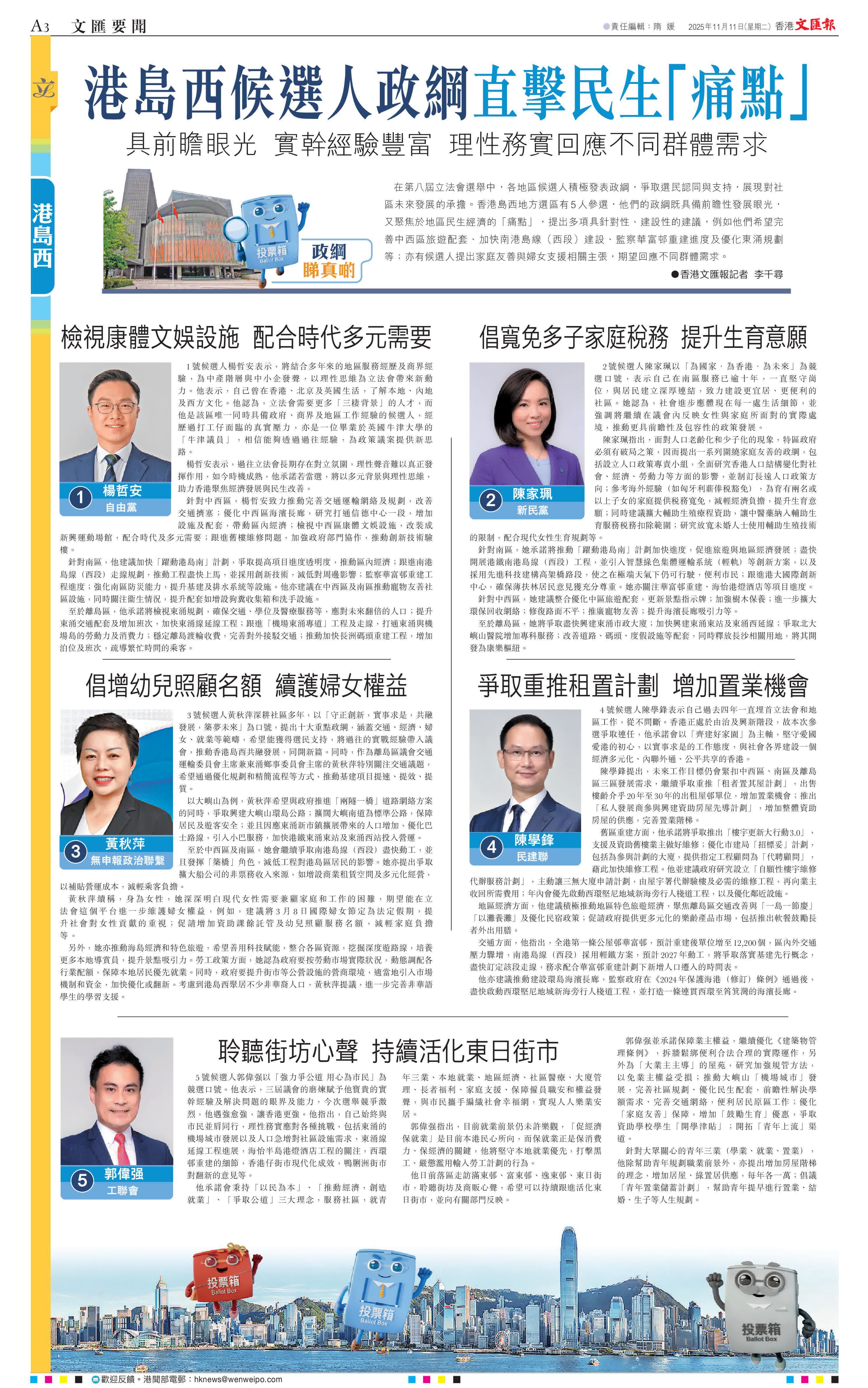 (香港文匯報記者 李千尋)在第八屆立法會選舉中,各地區候選人積極發表政綱,爭取選民認同與支持,展現對社區未來發展的承擔。香港島西地方選區有5人參選,他們的政綱既具備前瞻性發展眼光,又聚焦於地區民生經濟的「痛點」,提出多項具針對性、建設性的建議,例如他們希望完善中西區旅遊配套、加快南港島線(西段)建設、監察華富邨重建進度及優化東涌規劃等;亦有候選人提出家庭友善與婦女支援相關主張,期望回應不同群體需求。