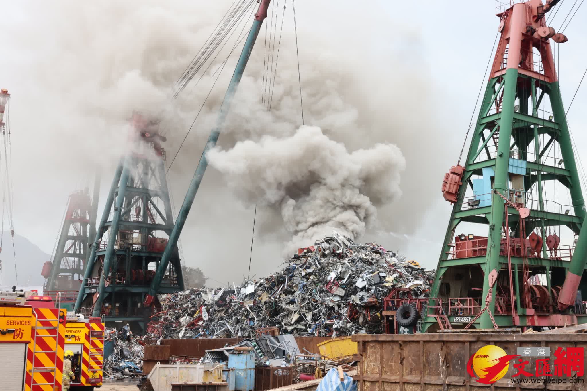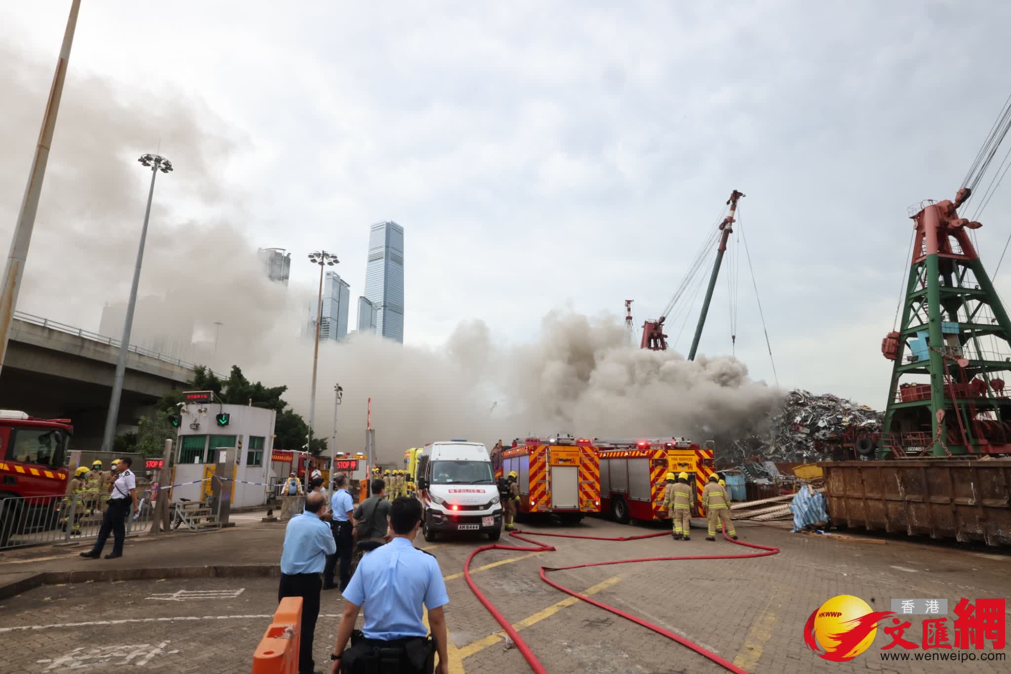 香港文匯報訊(記者 蕭景源)今日(11日)中午12時許,新油麻地避風塘一艘載有鋼材等回收物料的躉船突然起火,火勢迅速蔓,一度並傳出爆炸巨響,大量濃煙直衝逾百米半及飄至附近街道,遠近皆見。消防員接報趕至開喉灌救,滅火輪亦奉召到場協助射水,至下午2時45分大火仍在灌救中,暫未有受傷報告。