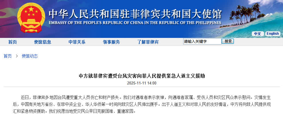 11月11日,中國駐菲律賓大使館網站發布消息,中方就菲律賓遭受颱風災害向菲人民提供緊急人道主義援助。全文如下: