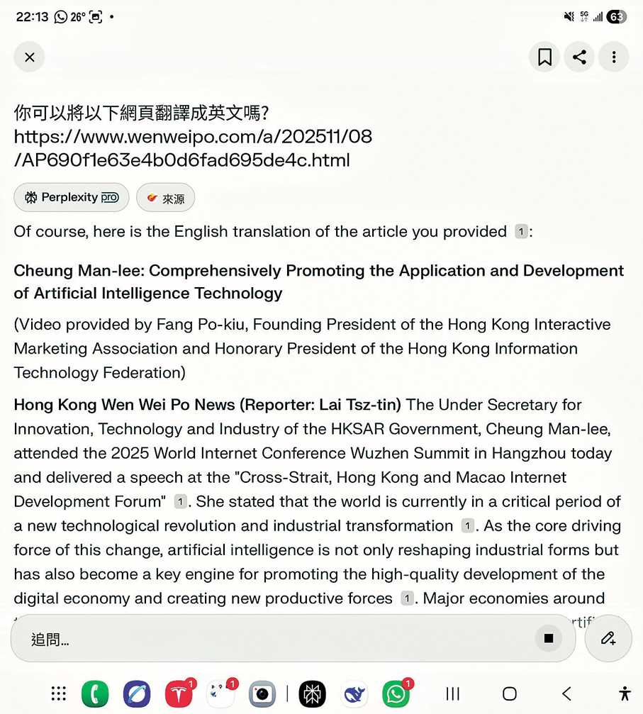 就現時的AI應用而言,香港資訊科技商會榮譽會長方保僑(Francis)分析指出,各大手機品牌已內置不少AI功能,例如蘋果的Apple Intelligence、三星的Galaxy AI,以及各款Android手機的Gemini功能,讓消費者開箱即用。其中最常見的,莫過於Siri、Google Assistant等語音助理,能處理設定鬧鐘、查詢天氣等日常瑣事。此外,AI亦強化了攝影功能,能自動識別場景並調整至最佳設定,甚至具備進階的圖像編輯能力。部分新型號手機更加入「畫圈搜尋」、AI即時翻譯及筆記助手等功能,進一步提升使用體驗。