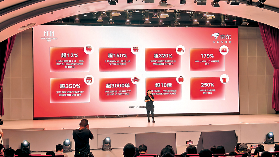 今年的「雙十一」購物狂歡節接近尾聲,香港文匯報記者在昨日舉行的京東「11.11」媒體開放日上獲悉,在超級供應鏈的帶動下,今年雙十一消費熱點更加多元。在京東平台,服務消費支出佔比達60.9%,十餘種創新業態首次亮相並獲得爆發式增長;帶電產品(有電池或需要配套電池才能正常工作的電子產品)銷售表現亮眼,3C數碼AI產品以及家電家居帶電新品成交額均同比增長超100%,大屏AI手機、遊戲筆記本的C2M定製比例分別超過30%和50%。