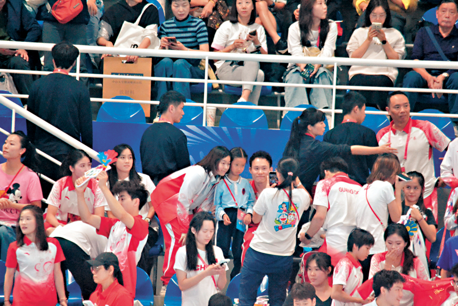 由於昨日是十五運會跳水項目最後一個比賽日,還沒有離開廣州的各路跳水奧運冠軍、世界冠軍都在現場觀賽。全紅嬋、謝思埸還不忘與觀眾互動,並欣然接受合影的請求,現場氣氛融洽。
