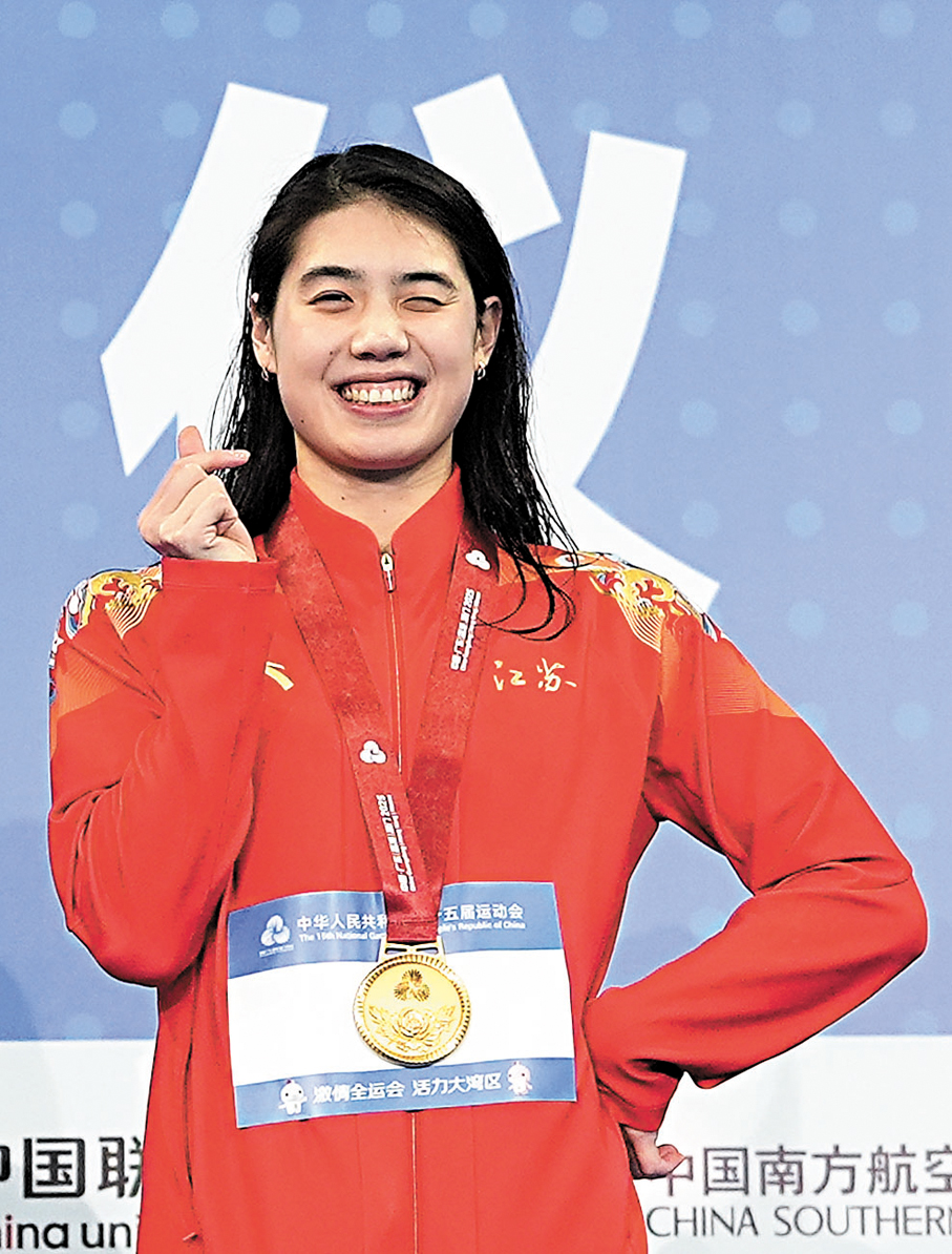 在女子100米蝶泳決賽中,江蘇隊張雨霏以56秒88獲得冠軍,拿到了個人在本屆全運會上的第一面金牌。賽後張雨霏表示,目前暫時沒有系統的規劃,只想健康快樂地游泳,朝着洛杉磯奧運會前進。「我也希望每年的比賽,大家都能看到一個不一樣的我,也希望『粉絲』能在我身上看到他們所期待的樣子,我們雙向奔赴。我希望我的一些事跡能夠激勵他們,而粉絲也給了我很大的力量,讓我十分感動。」