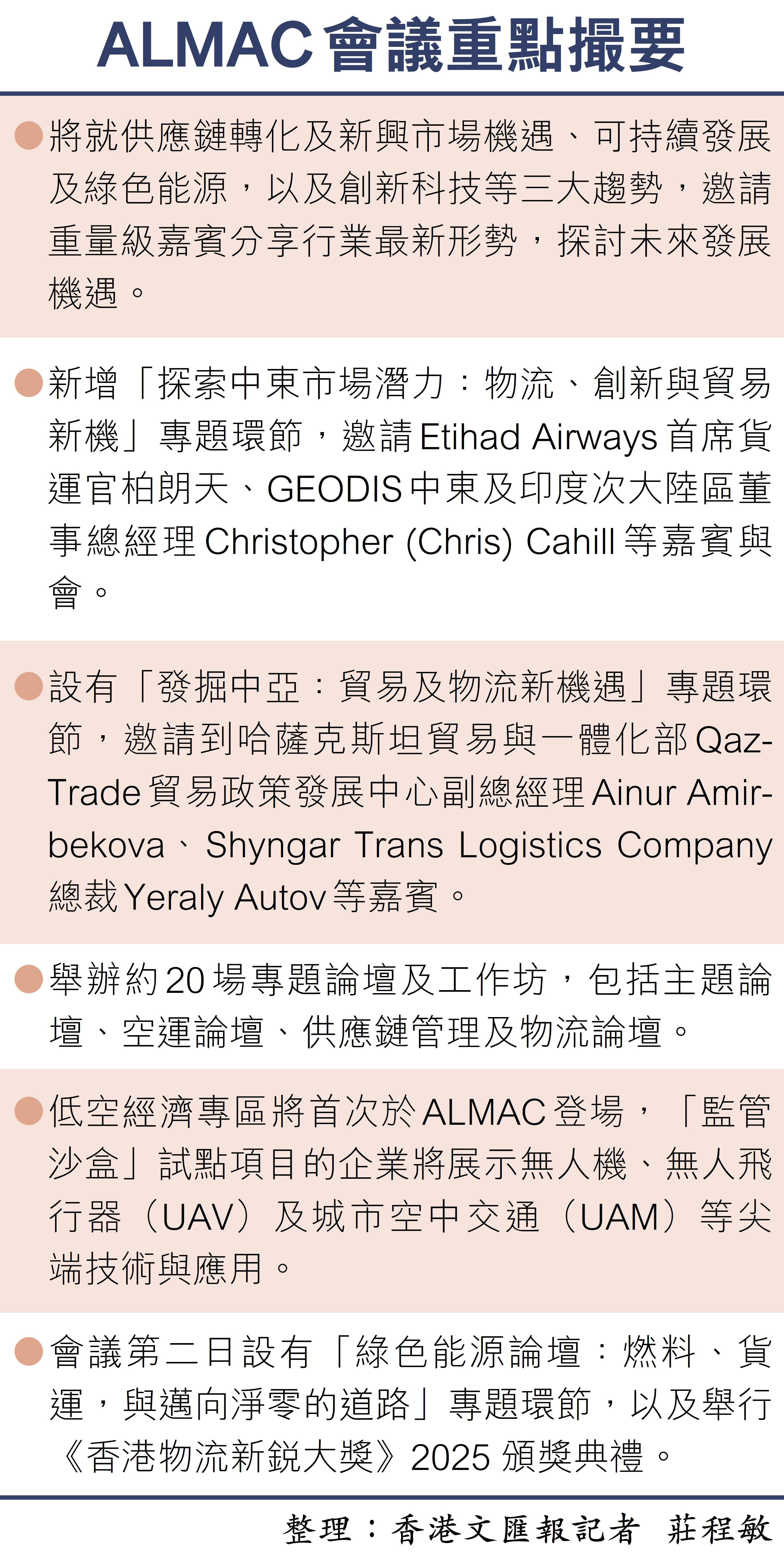 香港文匯報訊(記者 莊程敏)為了呼應國家「十五五」 規劃建議提出鞏固提升香港國際航運及空運中心的地位,及施政報告中一系列深化香港航運及空運發展的政策,第15屆「亞洲物流航運及空運會議」(ALMAC)將於11月17至18日(周一至周二)假灣仔會展舉行,屆時將匯聚逾80位重量級講者,料吸引來自逾40個國家及地區2,300位與會人士參與。今屆會議以「貿易新局:共創增長·協同共贏」為主題,共同探討物流、航運及空運趨勢及機遇,助力推動物流及供應鏈管理業高質量發展,協助企業深化國際交往,促成實質合作。