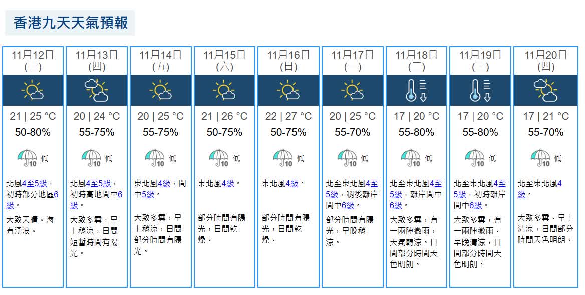 天文台已於昨(11日)晚9時40分取消所有熱帶氣旋警告信號。而強烈季候風信號現正生效,預料本港吹偏北強風,平均風速每小時超過40公里,陣風間中達烈風程度。