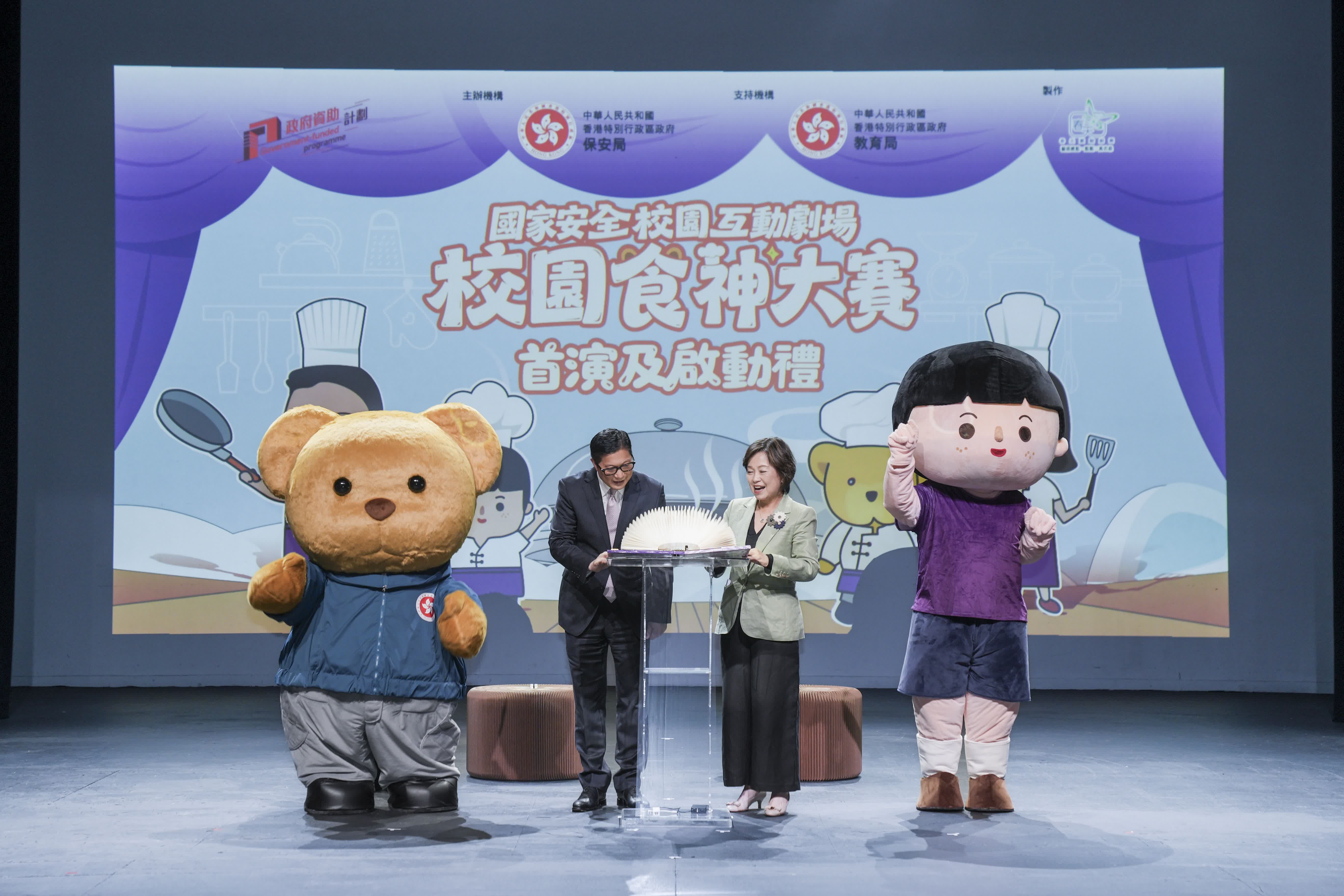 國家安全校園互動劇場《校園食神大賽》以保安局推出並深受學生歡迎的國家安全動漫系列《安仔與熊仔》為背景,通過生活化的劇情,用深入淺出的手法帶出重要的國家安全概念和信息。劇場更加入互動元素,讓學生可與主角安仔和保安熊仔透過問答及互動遊戲加深認識維護國家主權和安全的重要性以及對抗任何危害國家安全的不當行為。互動劇場由春天實驗劇團製作,昨日正式啓動後,劇團會在未來數個月到全港各區至少20間小學作校園演出。
