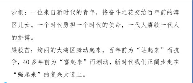 《時代華章》這個體現新時代灣區人民接續奮鬥的節目,讓無數觀眾印象深刻。這段節目不但有類似於舞台劇的情節表演,還有藝術感拉滿的舞蹈演出。如何將自己的聲音在講述故事和抒發情感之間切換,如何讓解說的情緒從平靜到湧動,再到噴薄而出?這種層層遞進的情緒創作非常考驗播音員的基本功。