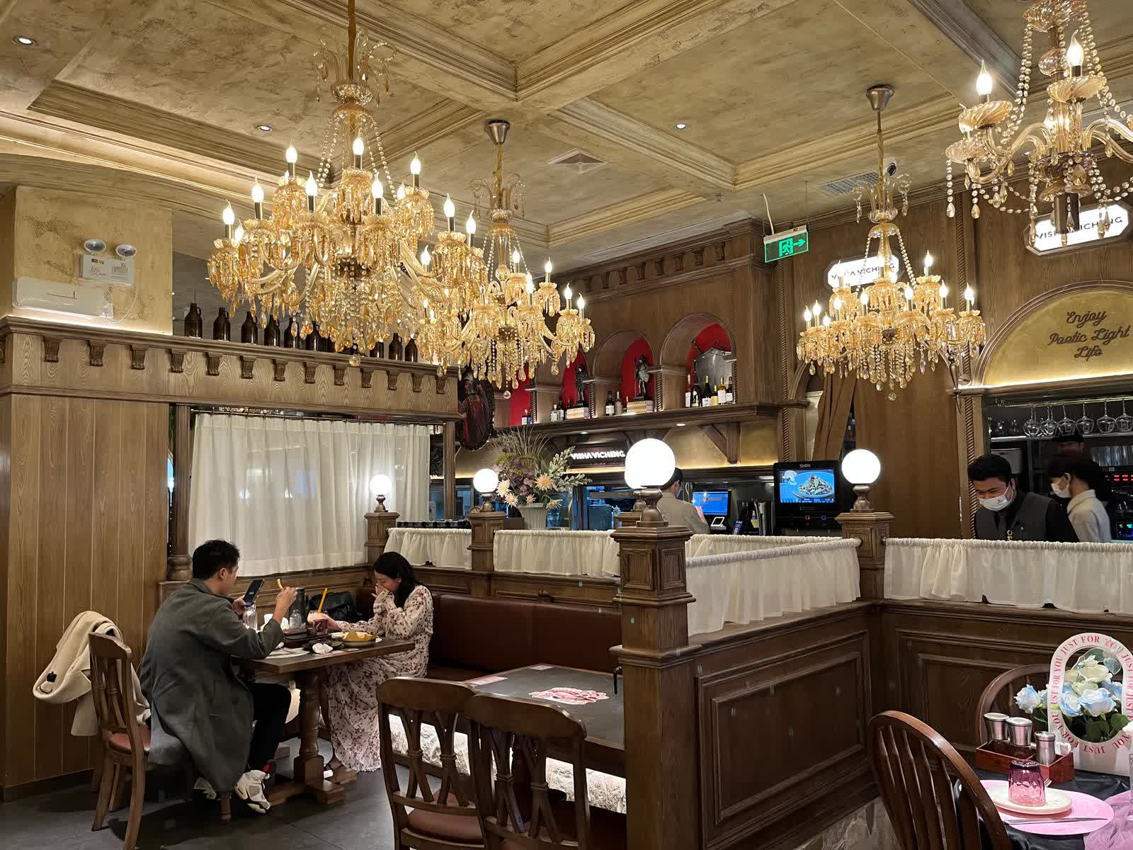 不過,一沙一城最強還是經典古堡風裝修,店內天花板不同水晶吊燈,古木風氛圍感十足,環境浪漫,適合情侶拍拖打卡。另一方面,店內亦設情侶座位經特別布置,枱面有哈佬吉蒂公仔陪食兼打卡,可謂拖友慶生之選,但要提前一日預訂。