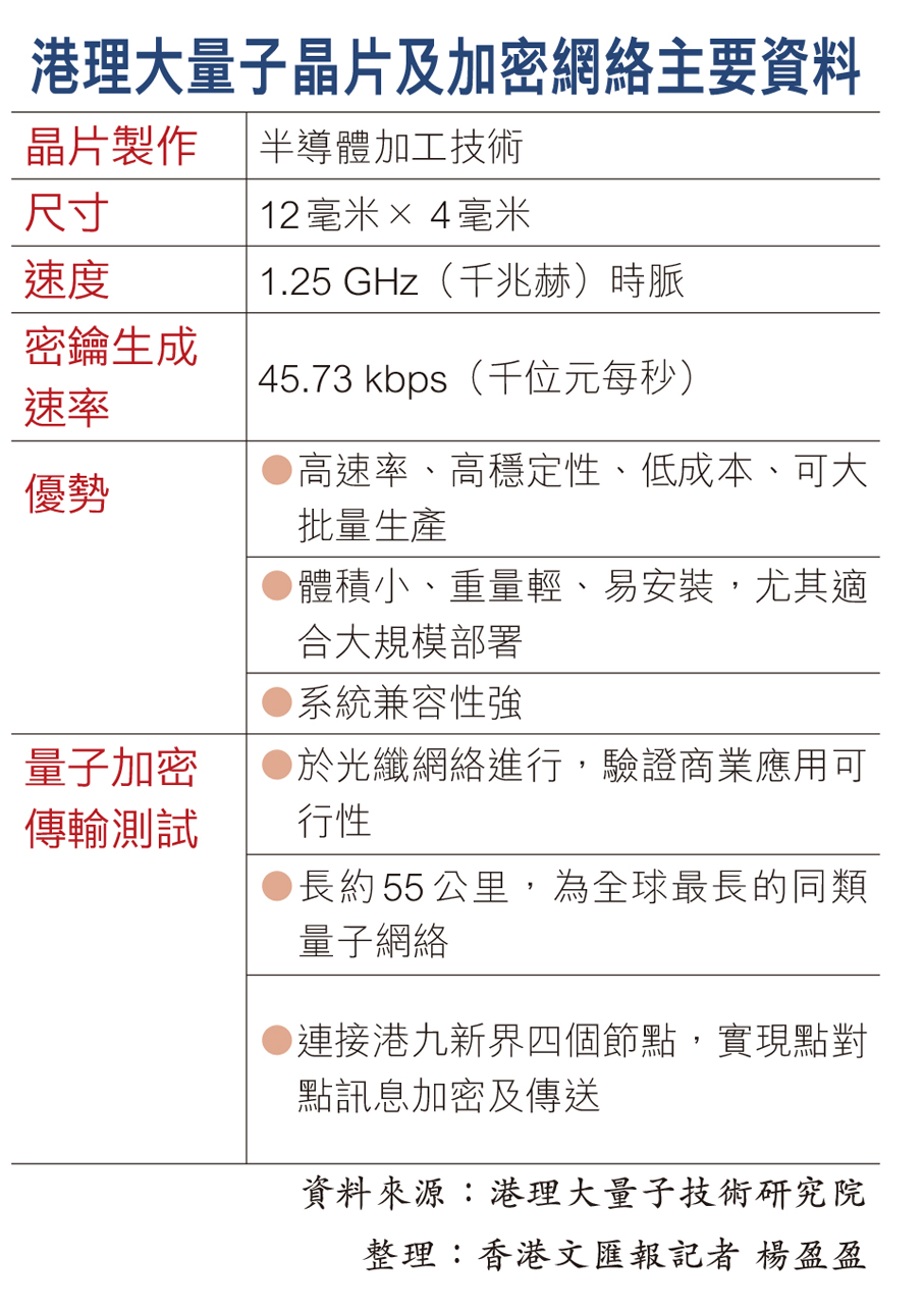 領導研究的港理大量子技術研究院院長、傑出創科學人劉愛群指,量子加密理論上無法破解,能有效保護數據安全,團隊的晶片技術目前已成熟,如有合適運營商便可望能即時落實商業化。