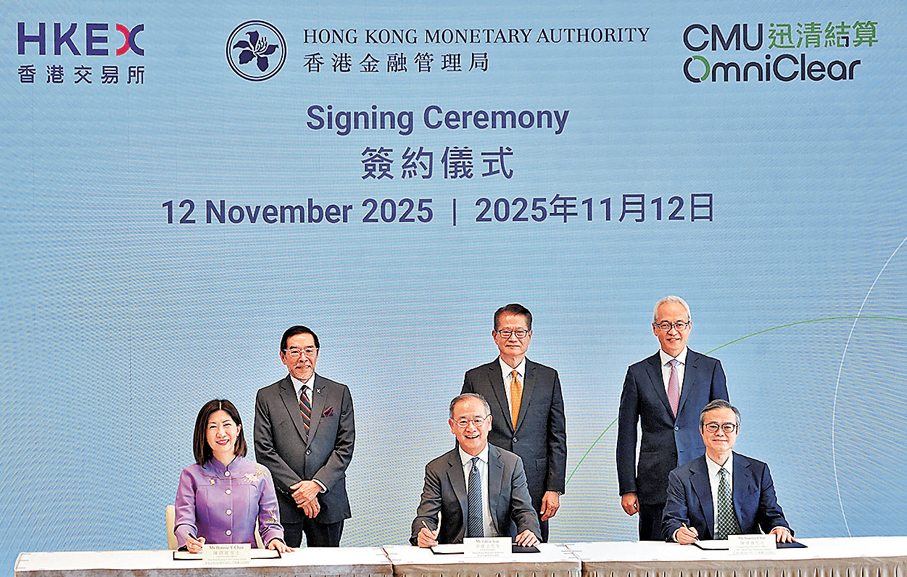 香港金融基建整合邁出戰略性一步,港交所(0388)與金管局旗下迅清結算控股達成股權合作協議,港交所斥最多4.55億元取得迅清結算控股20%股權。特區政府財政司司長陳茂波昨見證金管局、港交所與迅清結算控股簽署戰略合作協議,三方強強聯手推動「債務工具中央結算系統」(CMU)升級轉型,標誌着香港國際金融中心的底層架構將全面進化。這項制度創新不僅為市場開拓新增長曲線,更將構建貫穿債券、股票及數字資產的綜合結算生態系統,為迎接國際資金湧入中國資產鋪設超級跑道。 ●香港文匯報記者 馬翠媚