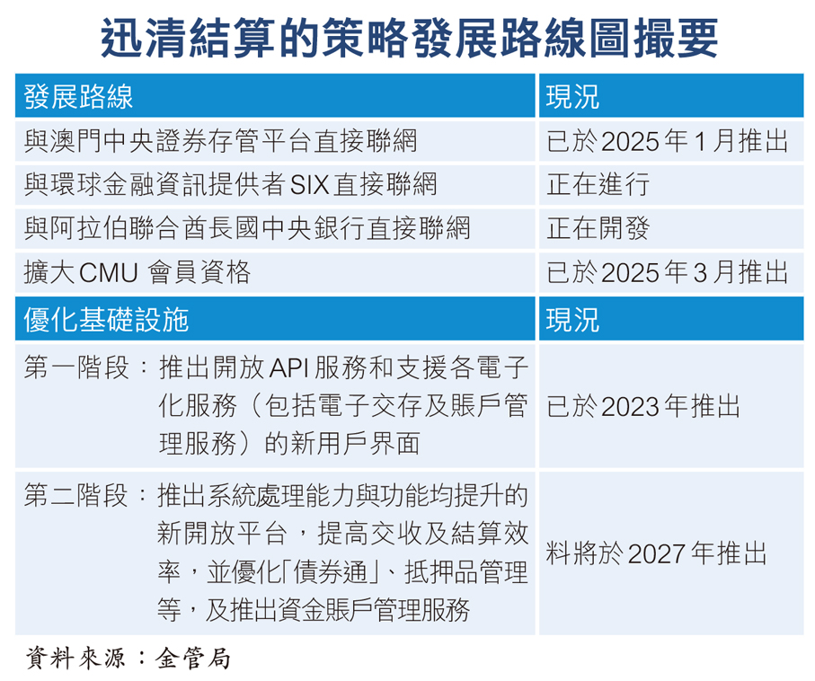 目前,金管局管理的迅清結算和港交所,分別作為本港固定收益產品和股票託管平台的營運者,對投資者而言,通過支持多種資產類別、跨地域的證券存管基礎設施,可有助他們更靈活、高效管理其資產,取得更好的回報。