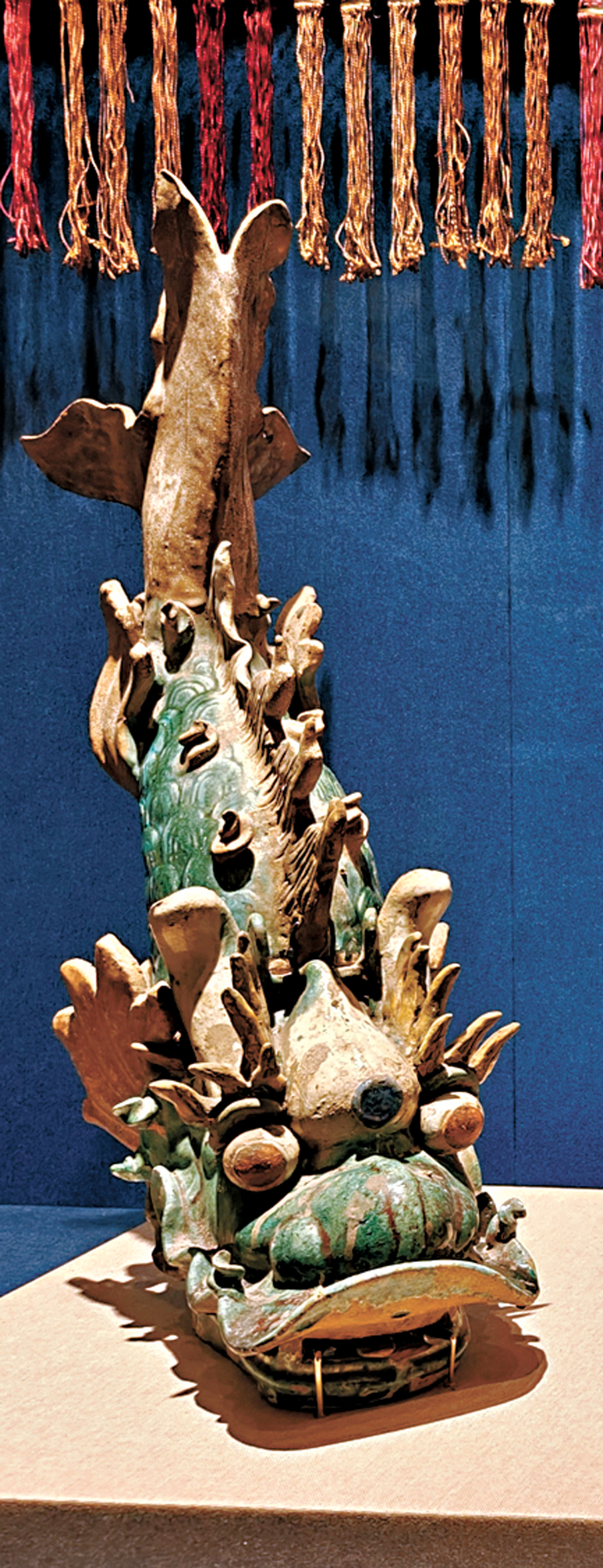 在嶺南地區,尤其是廣府風格的祠堂、廟宇和傳統民居的屋脊上,常見一對龍頭魚尾、造型生動的鰲魚裝飾,通常位於屋脊兩端,稱為「鰲魚吻」。對於許多廣州市民而言,最熟悉的鰲魚形象,是在陳家祠的屋頂之上。設計師將美好期許融入匠心雕琢,借 「獨佔鰲頭」 的傳統寓意,寄託了對後世子孫在科舉考試中榮登榜首、前程似錦的殷切祝福。在廣州博物館,則收藏着一件明萬曆年間的石灣窯鰲魚,原為佛山霍韜祠堂的脊飾兩端的裝飾物,它的色彩斑斕,黃、綠、紫三色交織,是廣州博物館的鎮館寶物之一。