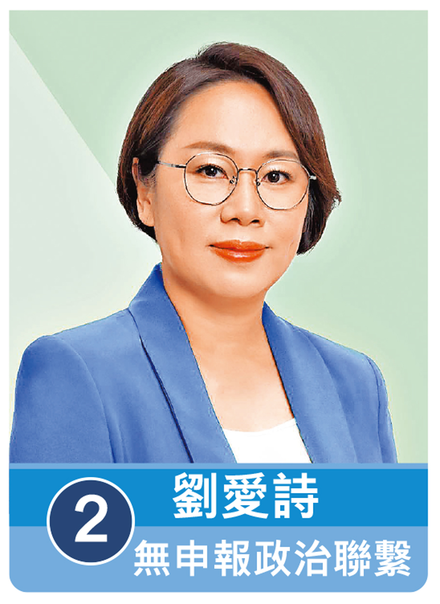 2號候選人劉愛詩是一名慈善機構總幹事,她以「為民生、敢創新」為競選口號,目標是將過去逾20年在傳媒及社福機構不同崗位所累積的寶貴經驗帶入議會,為民生、為社會、為香港做更多實事。她指出,自己除了是一間慈善機構的總幹事外,亦是一位雙職媽媽,是次參選是希望憑藉服務各階層的經驗,將民間聲音結合實務智慧,讓議會能以創新和「落地」的方法解決社會問題,為市民服務。