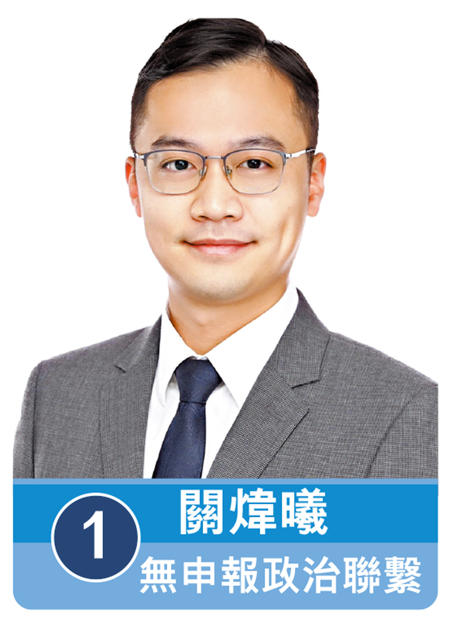 1號候選人、油尖旺區區議員關煒曦以「向前·曦望」為競選口號,其五大政綱主軸為「重民生、穩經濟、共連結、求突破、促發展」,涵蓋經濟民生、家庭支援、勞工就業、青年發展、市區更新及大灣區融合等多個範疇。他期望透過貼近市民所需的政策倡議,提升九龍西居民的生活質素。