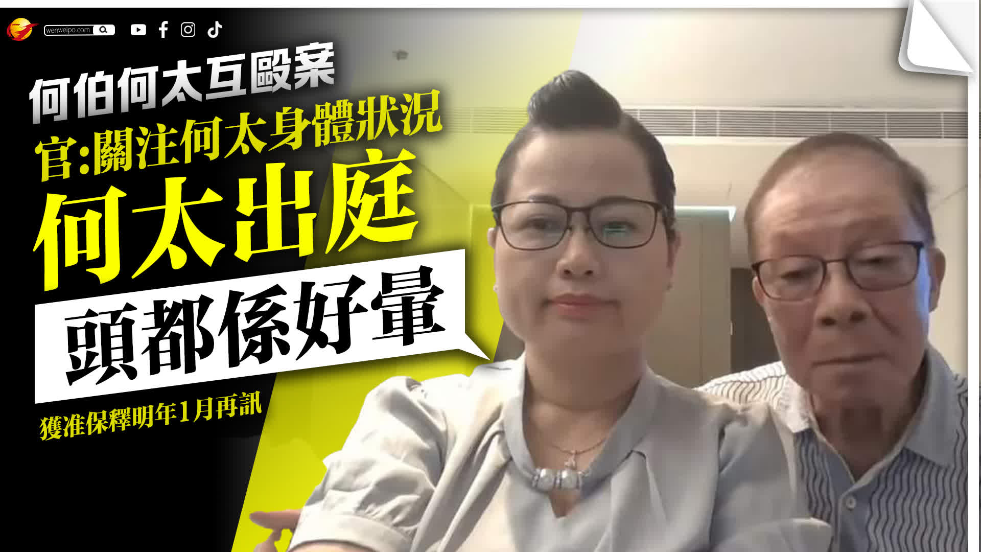何伯與何太葉秀定,兩人早前疑在屯門住所的升降機大堂打鬥,雙雙被控蓄意傷人罪。何太早前稱因精神問題留院未有應訊,今(13日)到區域法院應訊。