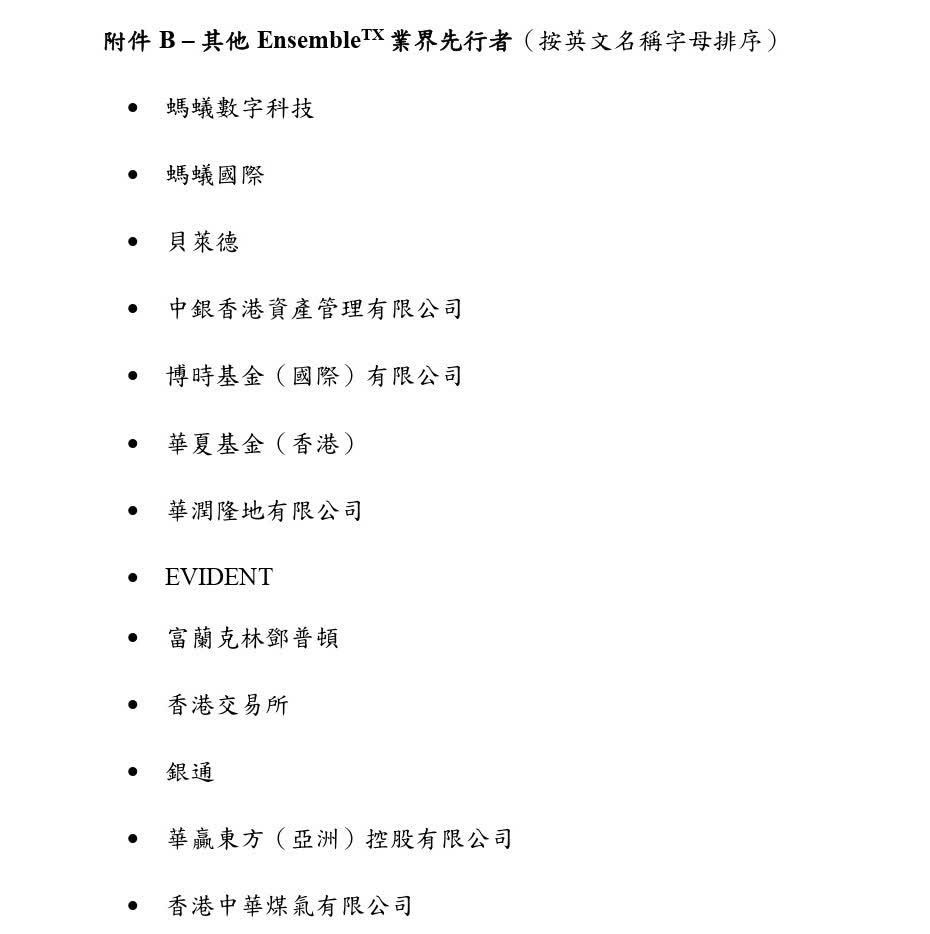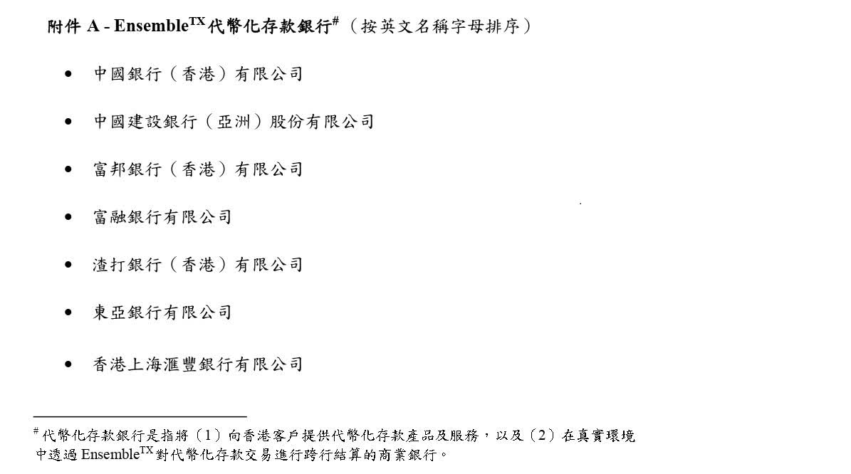 金管局指,EnsembleTX建基於Ensemble項目沙盒試驗的豐碩成果,自2024年8月啓動以來,Ensemble項目沙盒已讓業界先行者得以使用實驗型代幣化存款對數碼資產交易結算用例進行端對端測試。在試行階段中,金管局、代幣化存款銀行(見附件A)及其他業界先行者(見附件B)旨在實現更快速、透明且高效的真實代幣化交易結算。