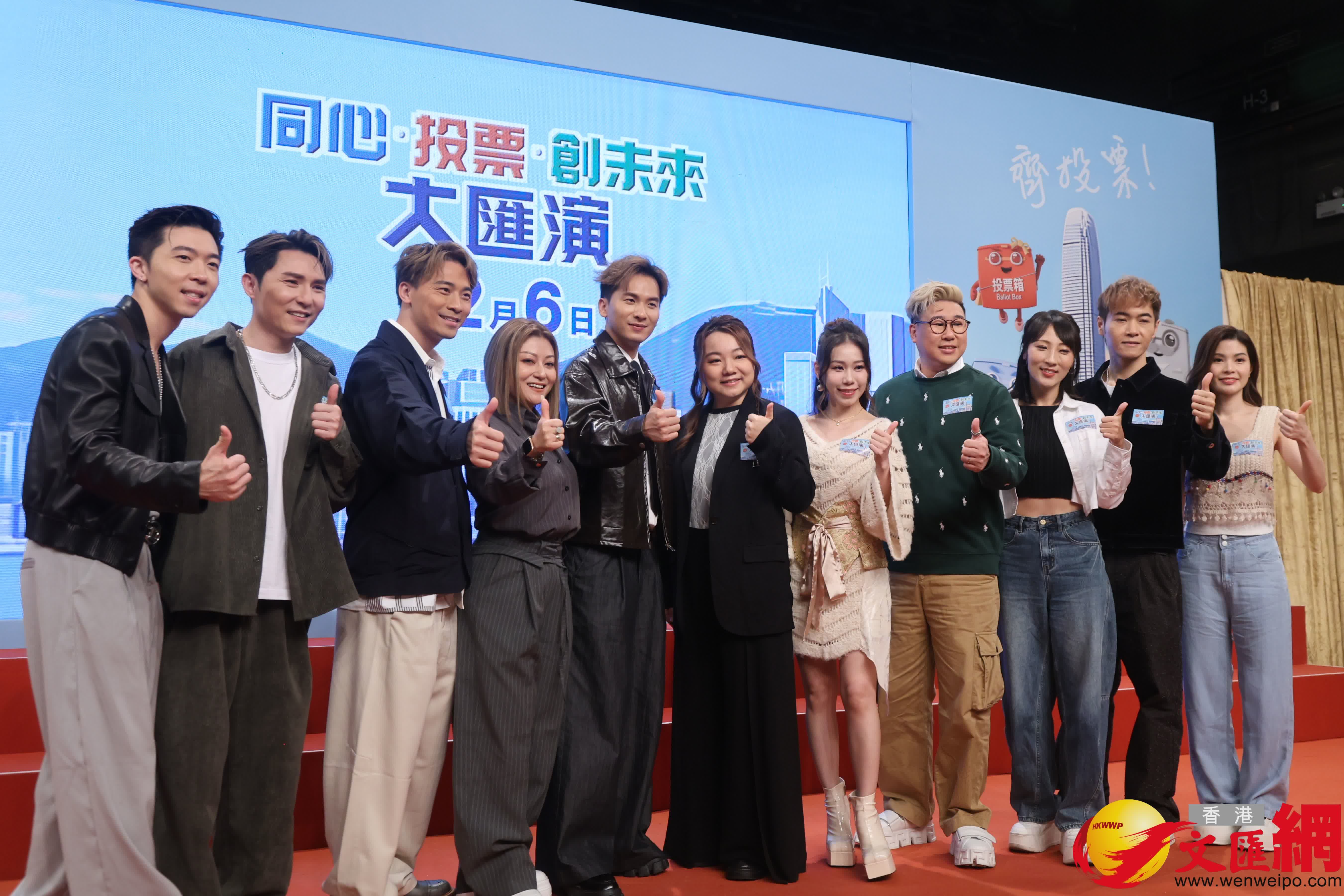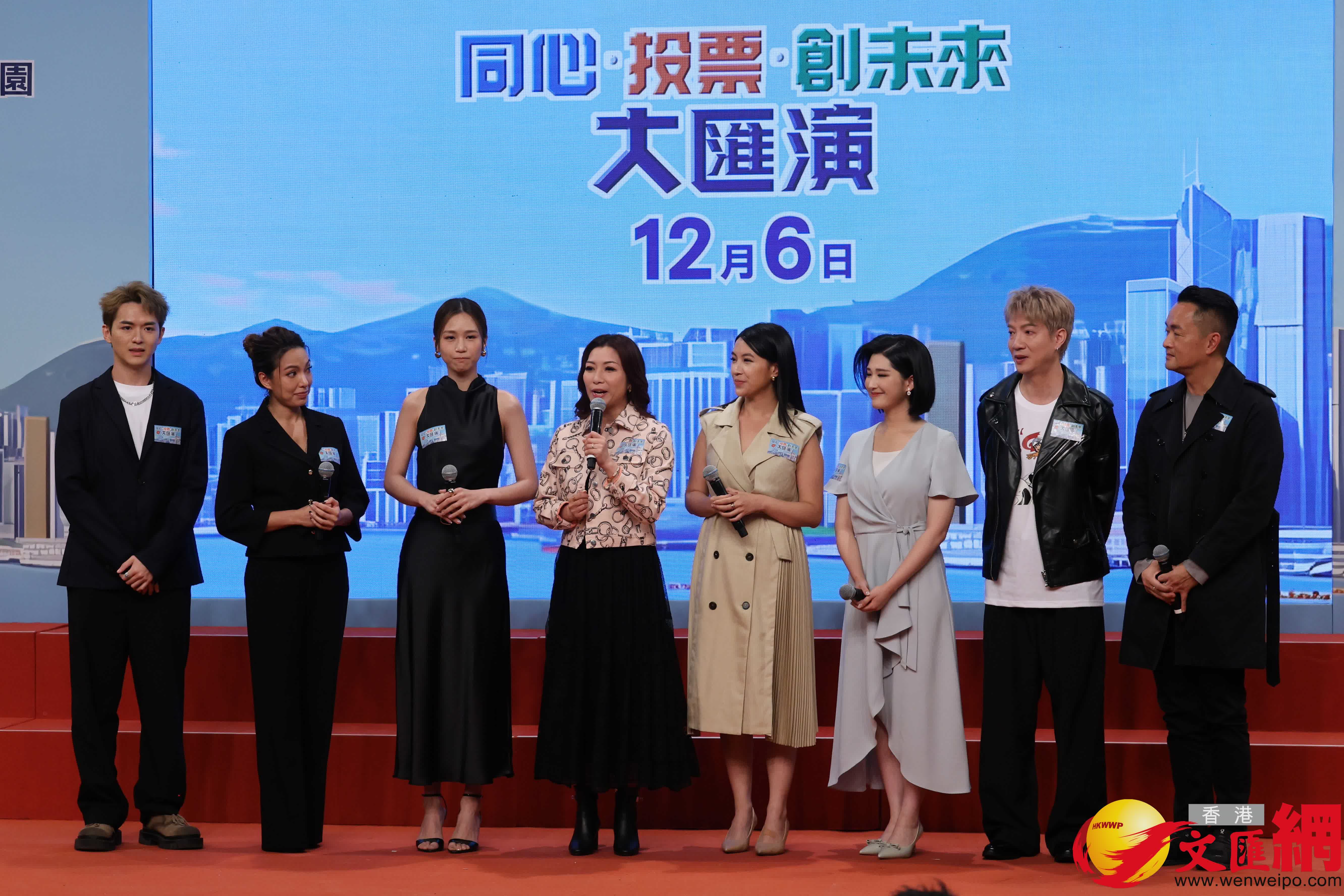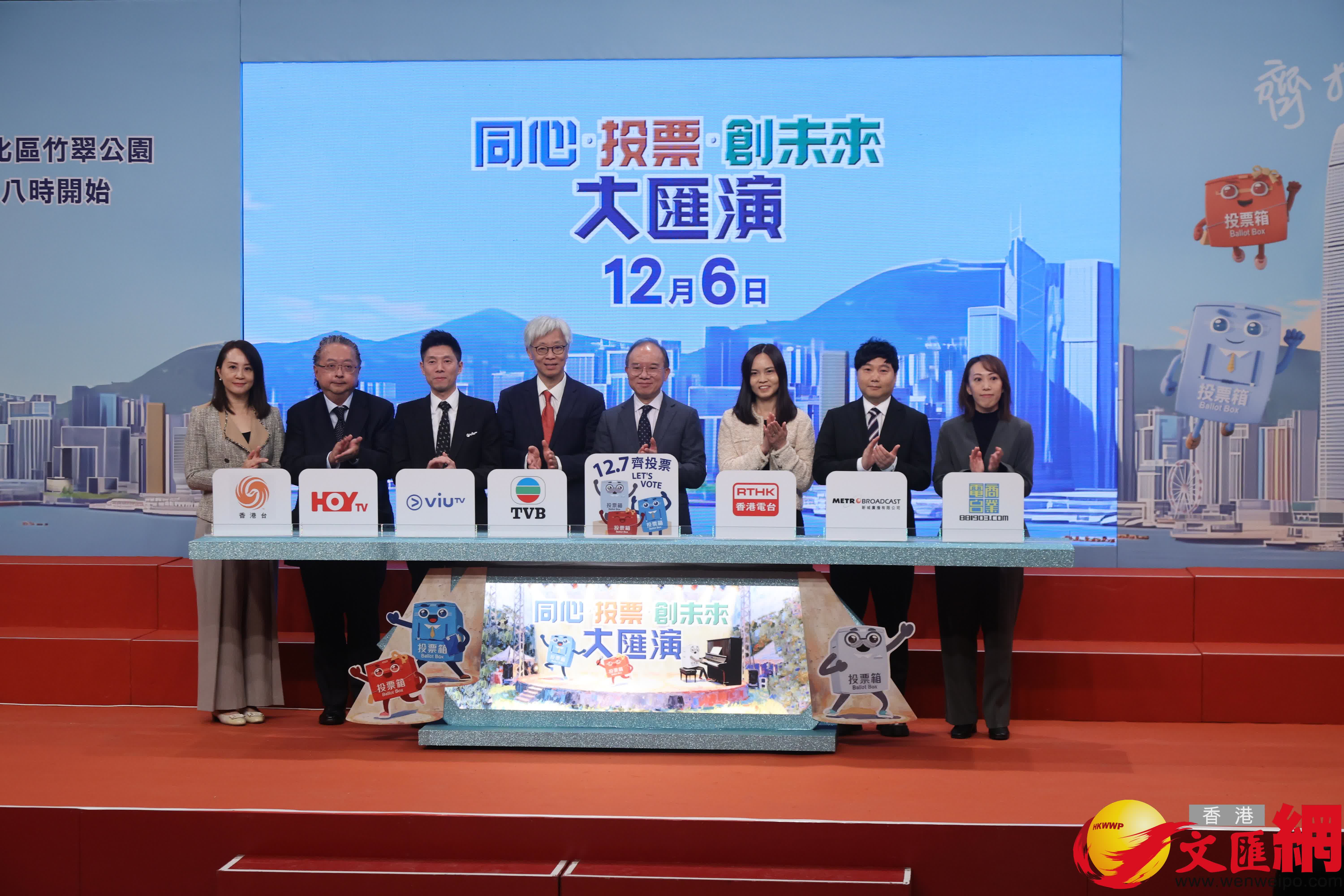 香港文匯報訊(記者 阿祖、達里,攝影 黃艾力)為進一步提升選舉氣氛及社會關注度,呼籲全港選民在12月7日立法會換屆選舉投票日踴躍投票,香港特區政府將於12月6日晚上8時在西九文化區竹翠公園舉行大型戶外綜藝晚會《同心.投票.創未來大匯演》。大匯演節目會由本港7間電子傳媒,即無綫電視、ViuTV、HOY TV、鳳凰衛視、香港電台、新城廣播及商業電台共同作現場聯播。