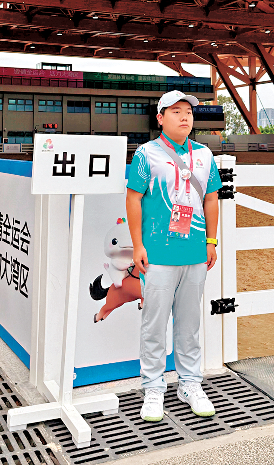 「請出示您的證件,麻煩這邊登記後再進入訓練場。」比賽期間,龐飛鴻每天都要重複無數次這樣的話語。作為熱身訓練場的管理志願者,他的工作瑣碎卻至關重要:控制馬匹與人員的進出、檢查證件、管理通道秩序,阻止無關人員干擾運動員訓練。