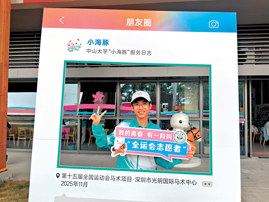 11月13日清晨,深圳光明國際馬術中心的賽道尚未被晨光完全照亮,一支身着統一服裝、精神抖擻的「小海豚」志願者隊伍已悄然集結。他們來自中山大學深圳校區17個院系,共220人,鍾慶豪、龐飛鴻和李載玟三位就讀港生也在其中。在十五運會的馬術賽事中,他們帶着香港青年的熱忱與擔當,與內地志願者(港稱義工)夥伴並肩作戰,不僅認識了全新的運動領域,更收穫了跨越地域的情誼與全方位的成長。