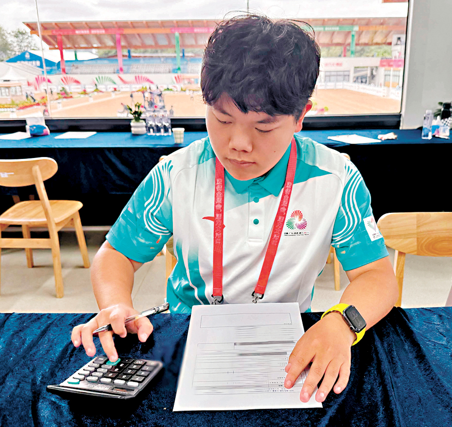 與龐飛鴻的「場外守護」不同,就讀於中山大學集成電路學院的鍾慶豪,主要在裁判樓二樓的裁判輔助崗提供志願服務。每天,他需要接收裁判遞交的紙質評分表,與電腦上的電子分數逐一核對,確保數據準確無誤。「裁判輔助崗的培訓特別細緻,連評分表的核對流程都演練了十幾遍。」鍾慶豪告訴香港文匯報記者,馬術項目的評分涉及多個維度,紙質評分表與電子分數的核對不能出現絲毫差錯。