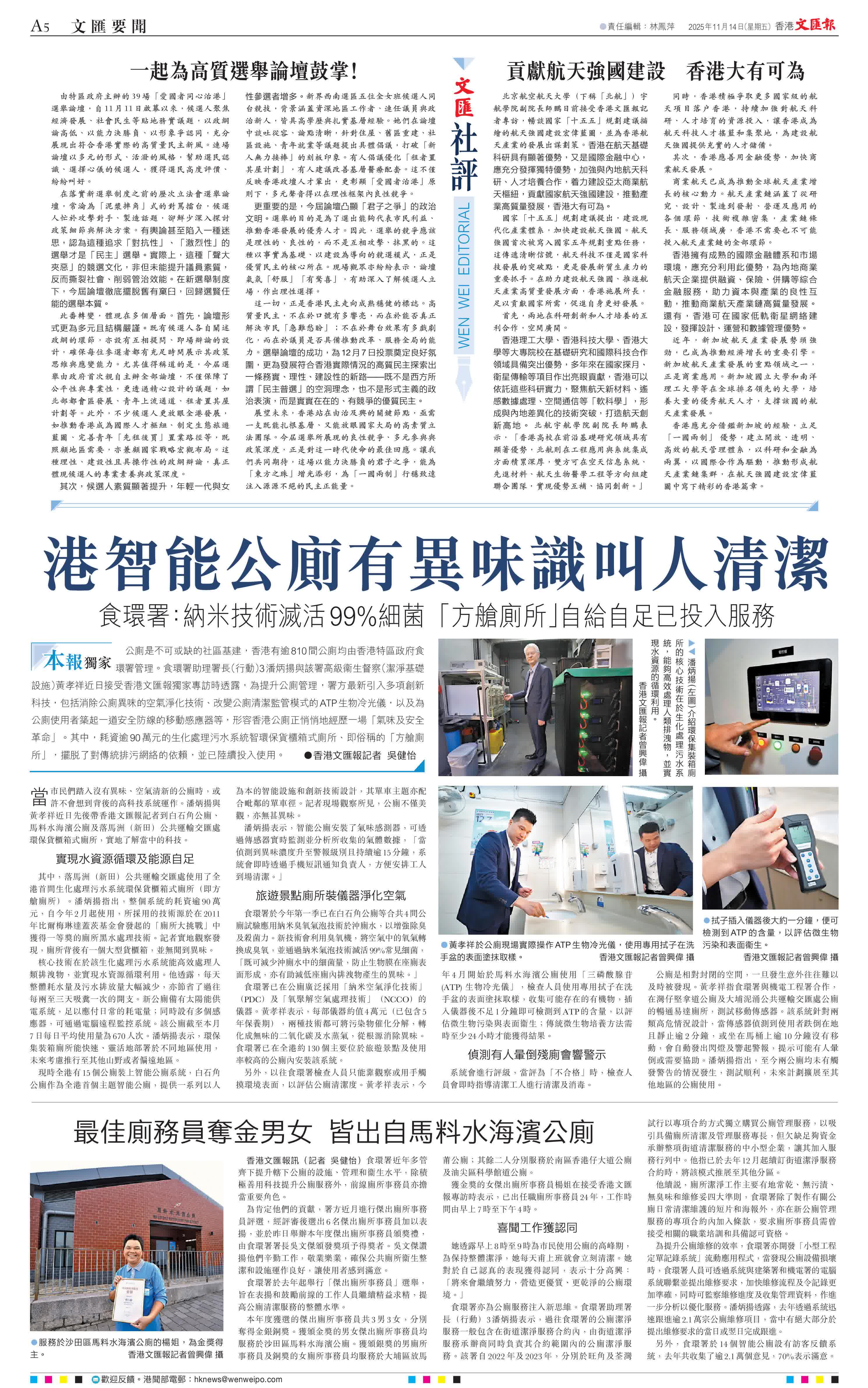 (香港文匯報記者 吳健怡)公廁是不可或缺的社區基建,香港有逾810間公廁均由香港特區政府食環署管理。食環署助理署長(行動)3潘炳揚與該署高級衞生督察(潔淨基礎設施)黃孝祥近日接受香港文匯報獨家專訪時透露,為提升公廁管理,署方最新引入多項創新科技,包括消除公廁異味的空氣淨化技術、改變公廁清潔監管模式的ATP生物冷光儀,以及為公廁使用者築起一道安全防線的移動感應器等,形容香港公廁正悄悄地經歷一場「氣味及安全革命」。其中,耗資逾90萬元的生化處理污水系統智環保貨櫃箱式廁所、即俗稱的「方艙廁所」,擺脫了對傳統排污網絡的依賴,並已陸續投入使用。