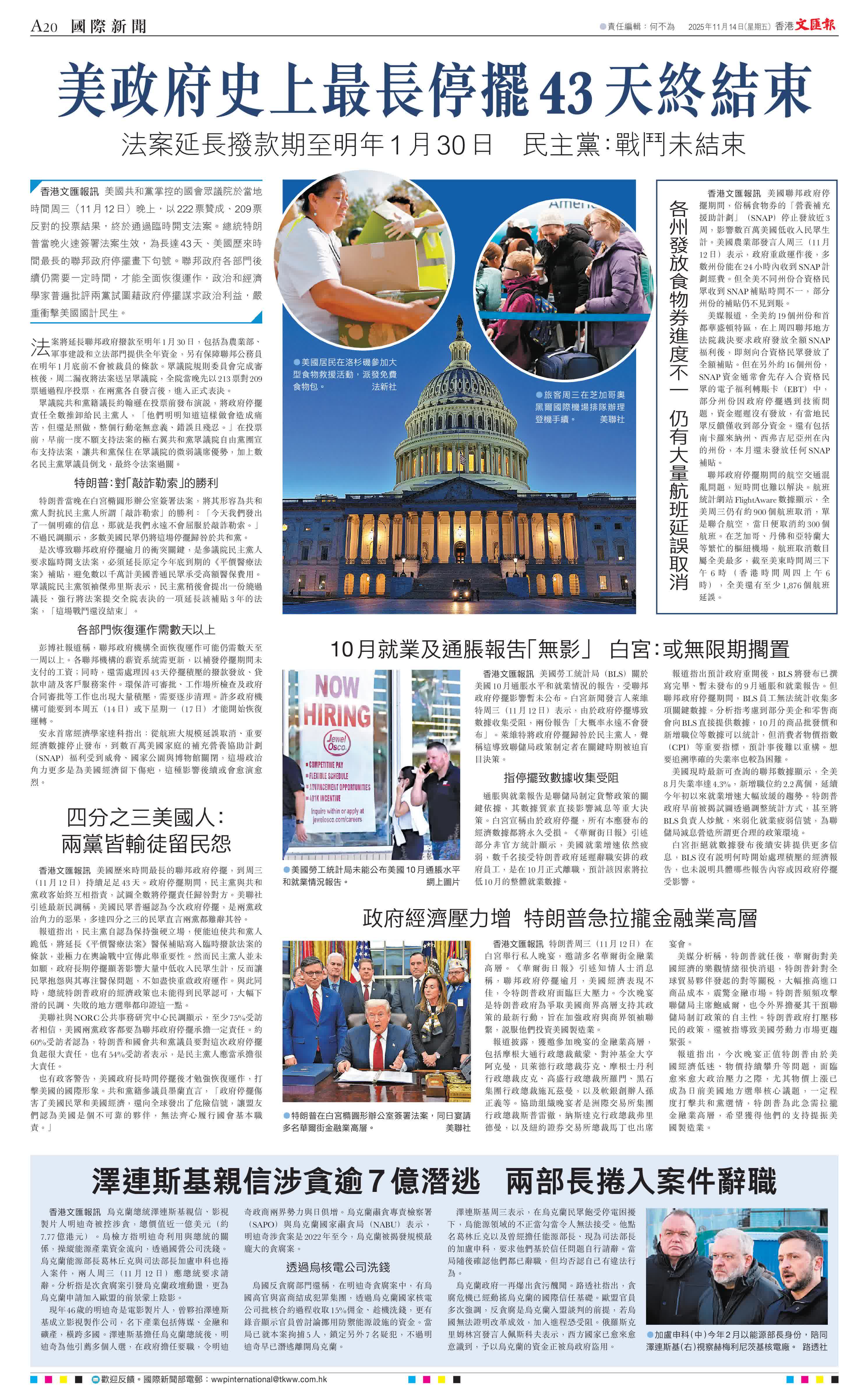 香港文匯報訊 美國共和黨掌控的國會眾議院於當地時間周三(11月12日)晚上,以222票贊成、209票反對的投票結果,終於通過臨時開支法案。總統特朗普當晚火速簽署法案生效,為長達43天、美國歷來時間最長的聯邦政府停擺畫下句號。聯邦政府各部門後續仍需要一定時間,才能全面恢復運作,政治和經濟學家普遍批評兩黨試圖藉政府停擺謀求政治利益,嚴重衝擊美國國計民生。
