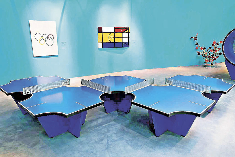而《動競藝境》則以藝術語言回應競技精神,展覽由3個核心展區構成:「夢幻球場」呈現佩博斯專為新濠天地打造的裝置作品《區域》,通過草皮鋪設與空間錯置營造出沉浸式場景,讓觀眾仿如置身於顛倒的網球世界。「身體神話」巧妙運用視覺錯覺的原理,重塑運球中的維納斯,並將籃球元素解構重組,塑造出新的美學形象。「乒乓花園」則打破既有的競技規則,將球桌扭曲、摺疊、延展,創造出充滿遊戲感的互動場景。