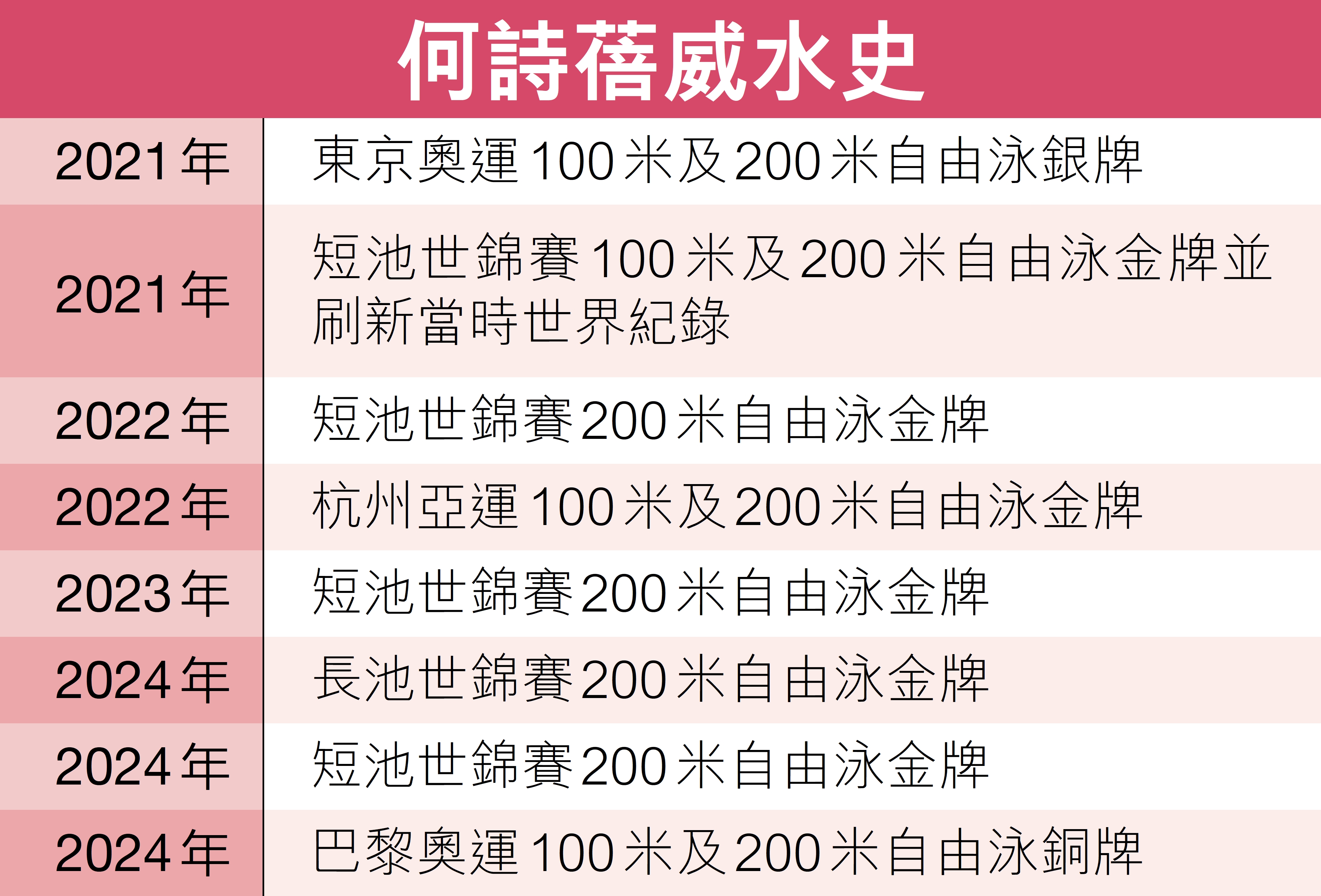 何詩蓓今早將轉戰另一強項100米自由泳預賽,如晉級將於晚上出戰半決賽,並力爭突破個人保持的亞洲紀錄52秒02。
