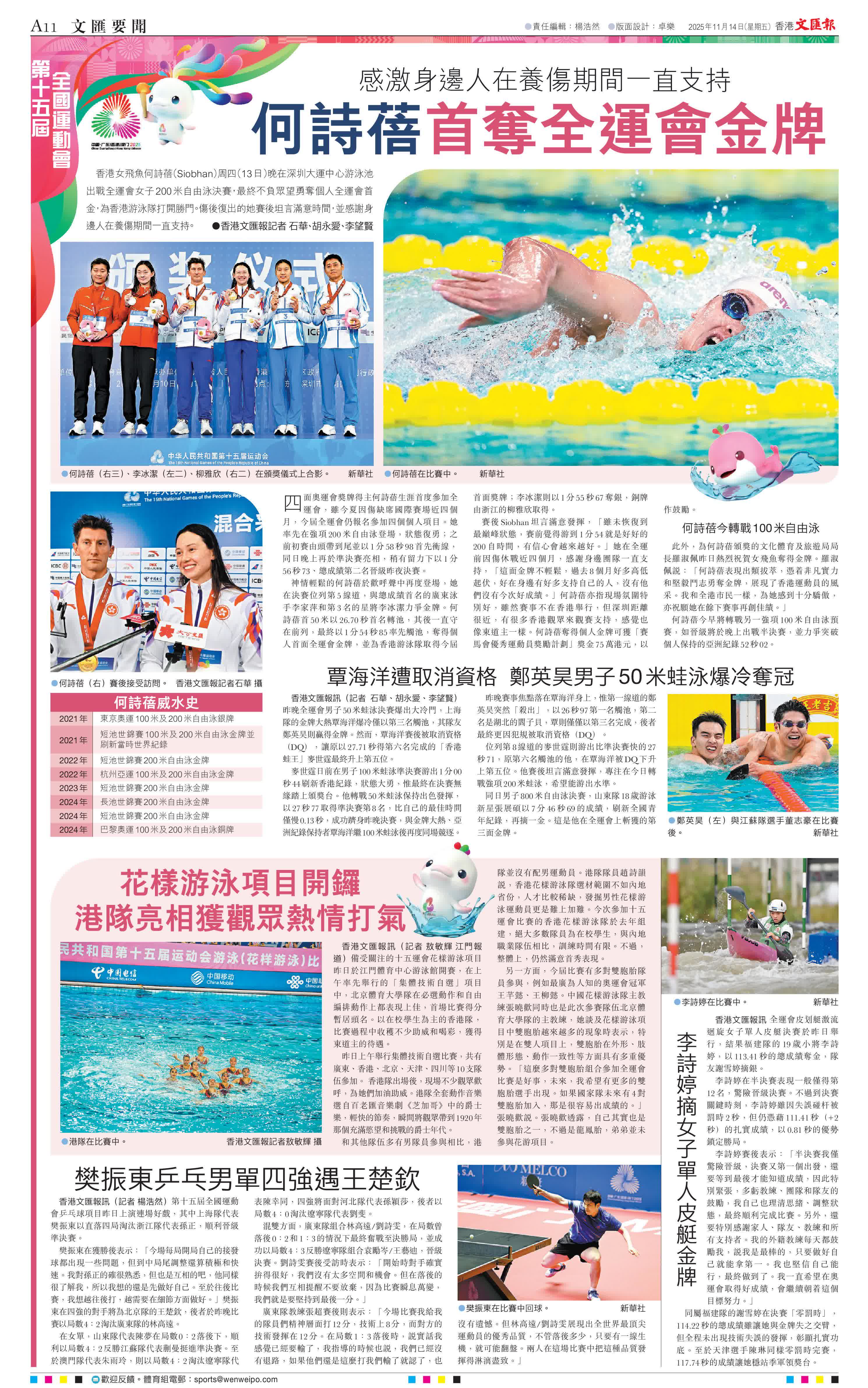 (香港文匯報記者 石華、胡永愛、李望賢)香港女飛魚何詩蓓(Siobhan)周四(13日)晚在深圳大運中心游泳池出戰全運會女子200米自由泳決賽,最終不負眾望勇奪個人全運會首金,為香港游泳隊打開勝門。傷後復出的她賽後坦言滿意時間,並感謝身邊人在養傷期間一直支持。