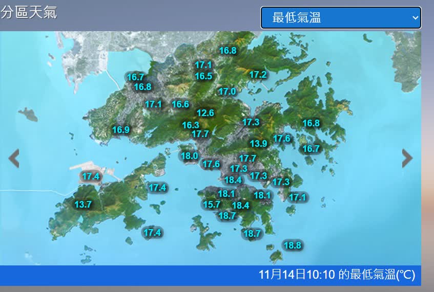 展望本港周末至下週周部分時間有陽光及乾燥,日間溫暖。明日(星期六)天氣大致多雲,日間部分時間有陽光及乾燥,氣溫介乎22至25度。星期日大致天晴,日間乾燥,氣溫介乎22至27度。星期一(17日)晚上北風增強,氣溫介乎20至26度。星期二顯著轉涼,多雲,有一兩陣微雨,天氣顯著轉涼,氣溫進一步下跌至只有15至20度。至星期三(19日)氣溫下降至僅有13至14度左右,天氣大致多雲早上相當清涼,日間部分時間天色明朗及非常乾燥。