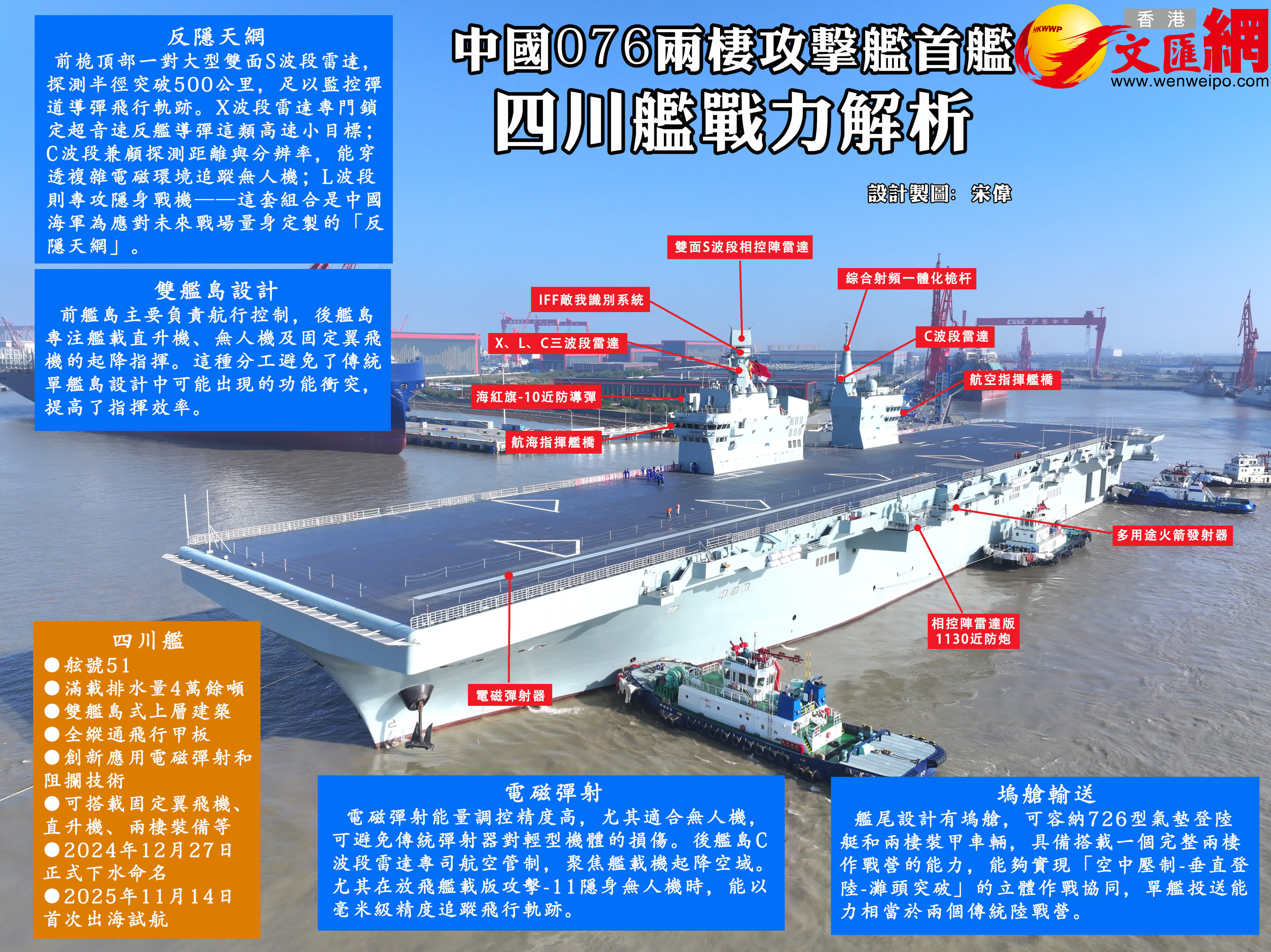 四川艦是全球首次採用電磁彈射技術的兩棲攻擊艦,舷號51,滿載排水量4萬餘噸,設置雙艦島式上層建築和全縱通飛行甲板,創新應用電磁彈射和阻攔技術,可搭載固定翼飛機、直升機、兩棲裝備等。