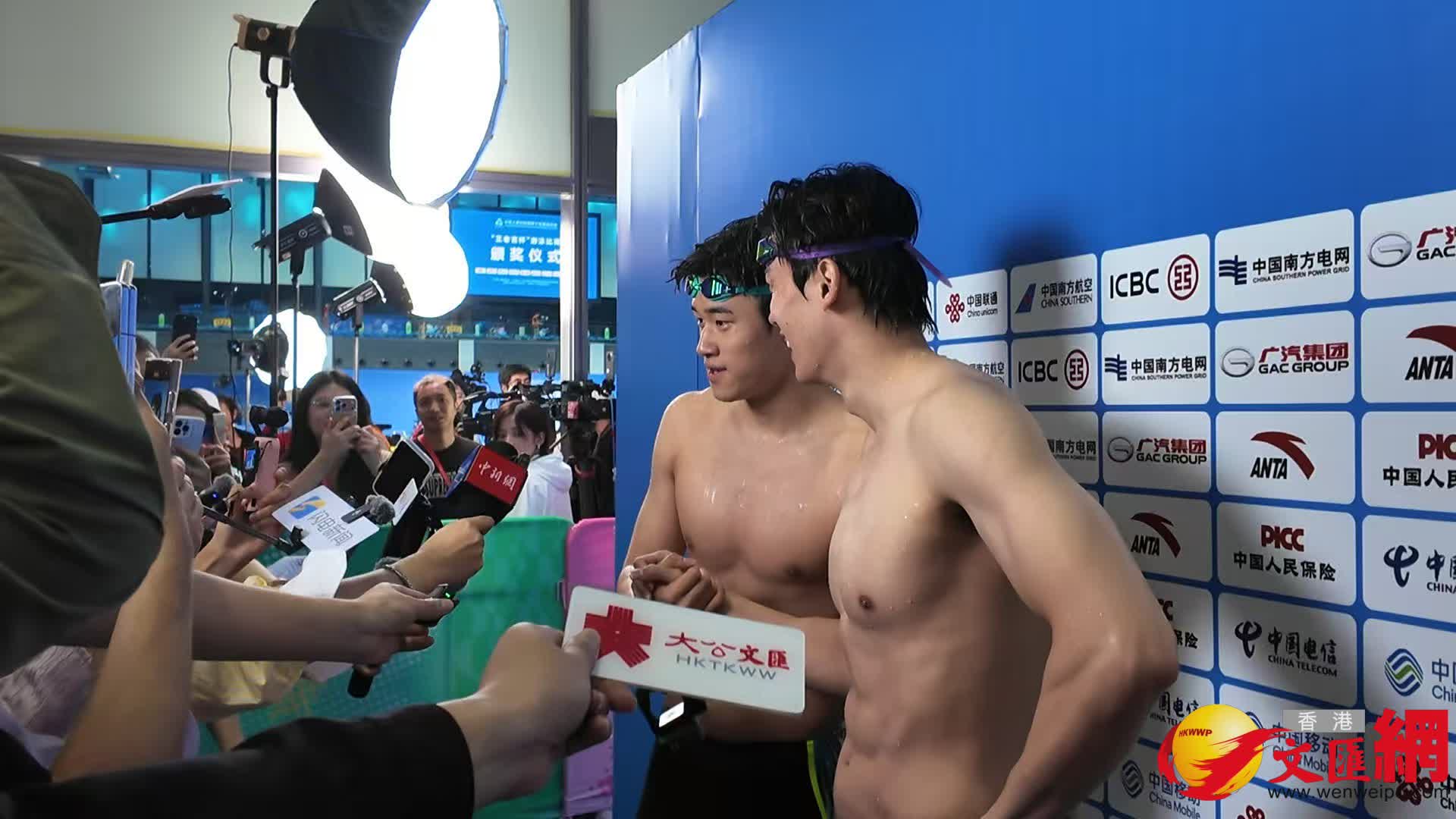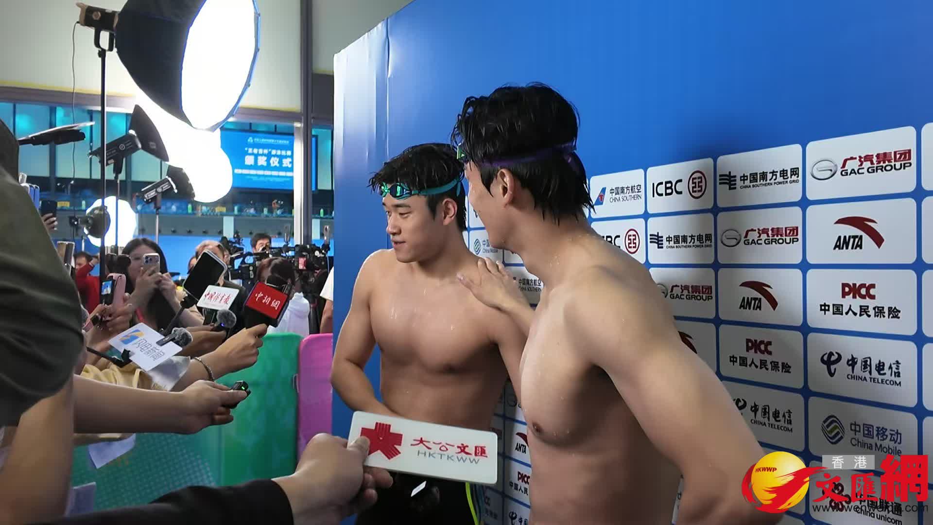 賽後採訪中,潘展樂偶遇男子200米混合泳冠軍汪順,兩位同樣來自浙江隊的冠軍握手拍肩膀,好友相互恭賀獲得各自項目的冠軍。