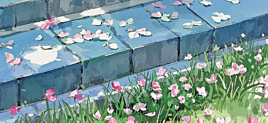 晨起開窗,清風撲面,帶着些微涼意。低頭間,瞥見樓下草地上幾株海棠落了大半,粉白的花瓣鋪在青草上,像潑墨人失手抖落的顏料,有的被風捲着,零零散散貼在牆角、樹根,連石階縫裏都嵌着兩三片,沾了晨露,似醒未醒的樣子。
