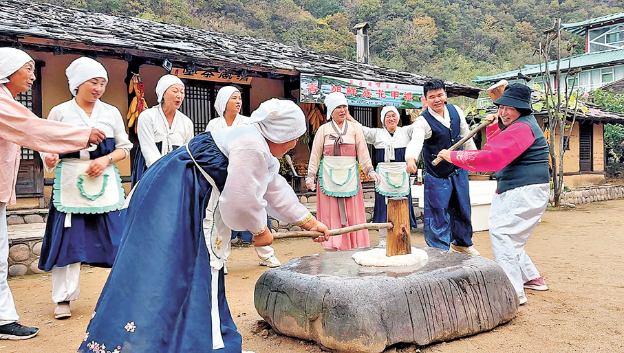 如今的三道河朝鮮族民俗村就是最早朝鮮人來到丹東定居的地點之一,村內其中一間泥土草房已有百餘年歷史。坐落在群山環繞間的民俗村,風光秀麗,山環水繞,生活在此的朝鮮族村民至今依然保持着能歌善舞、好客樂施、尊老重教、講究整潔的優良傳統和風俗習慣。原汁原味的朝鮮族文化、地道的朝鮮族美食、豐富多彩的民俗活動,讓人彷彿置身於朝鮮族的文化長廊。華燈初上,一桌熱氣騰騰的朝鮮族美食端上餐桌,打糕軟糯、冷麵爽滑、高麗火盆(一種朝鮮族美食)香氣誘人,引得遊客交口稱讚。