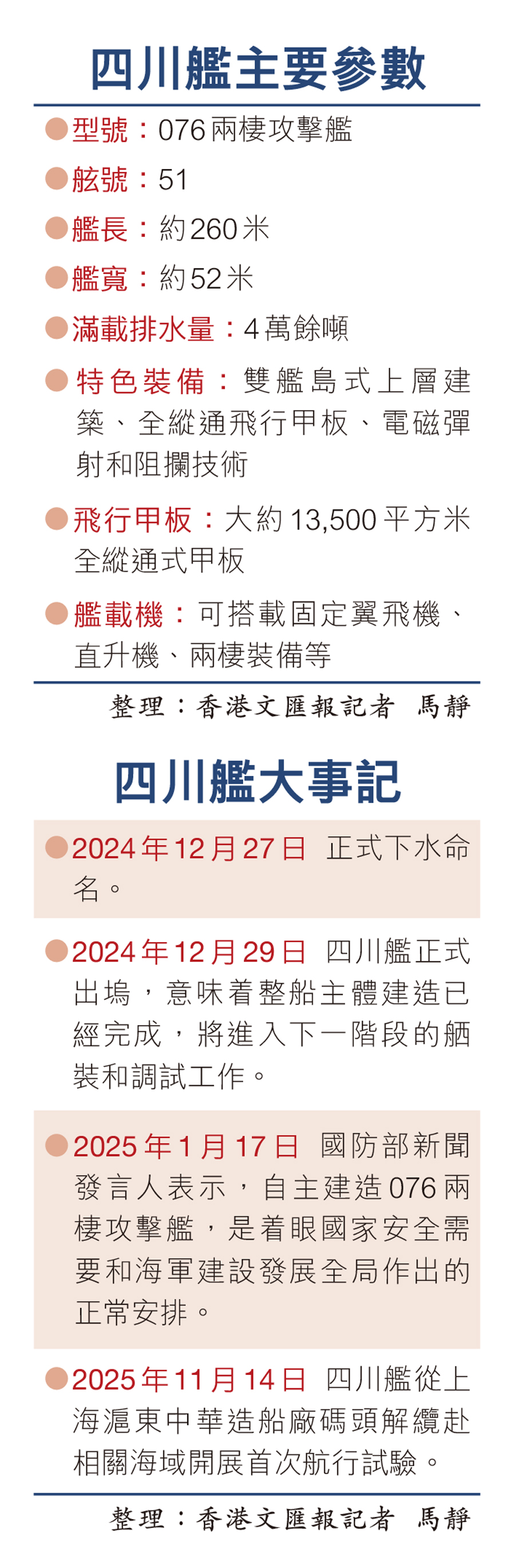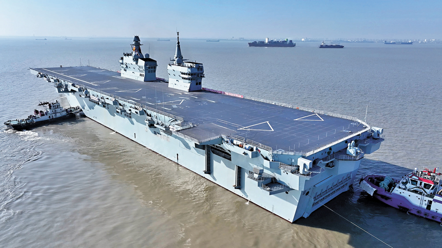 香港文匯報訊(記者 馬靜 北京報道)14日上午9時許,中國076兩棲攻擊艦首艦四川艦從上海滬東中華造船廠碼頭解纜啟航,在五艘拖船的牽引下,離開上海滬東中華造船廠碼頭,赴相關海域開展首次航行試驗任務。知名軍事專家張軍社接受香港文匯報記者採訪時表示,四川艦具有電磁彈射、雙艦島設計等核心優勢,戰力堪稱「小航母」。該艦具有極強的立體登陸作戰能力,未來完全可以執行打擊「台獨」分裂勢力、維護國家統一任務。
